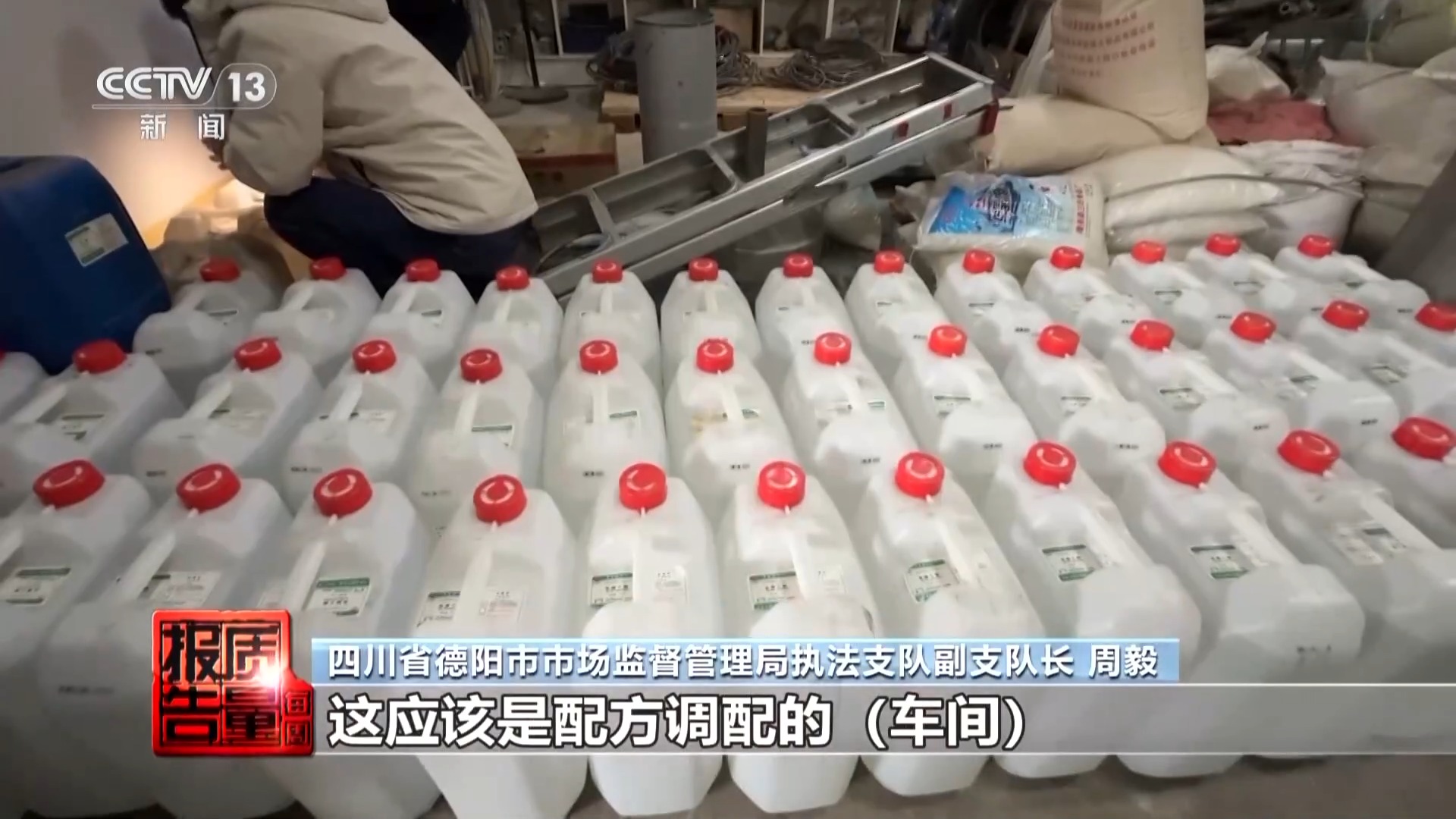 四川省德阳市市场监督管理局执法支队副支队长周毅:这应该是配料调配车间。这个就是食品添加剂乙酸乙酯,不同香型的酒,就需要不同的食品添加剂来勾兑。