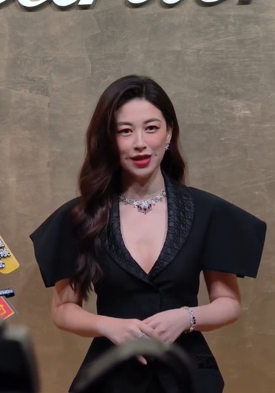 在卡地亚现场,她身穿深V修身礼服,大领口露出同色系的内衣,大大方方地展现自己的事业线。