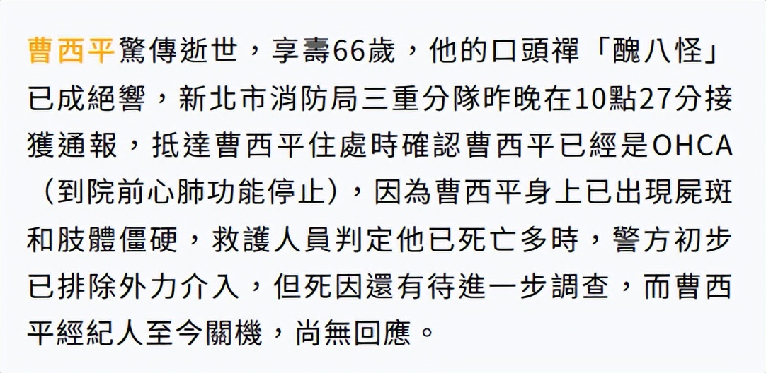警方初步已排除外力介入,死因需要进一步调查,而曹西平经纪人手机关机,暂时没有回应。