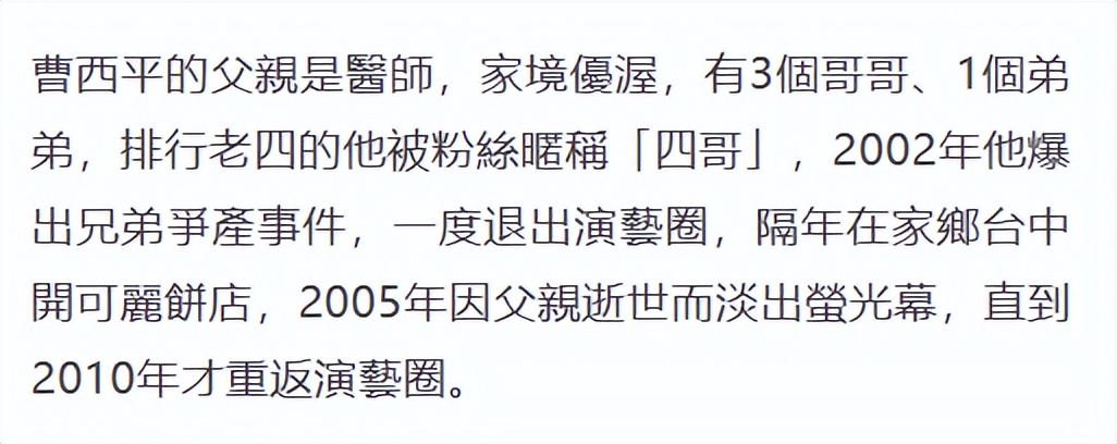 据台媒爆料,曹西平生前患有抑郁症,生前立好了遗嘱,不会留给曹姓家人,会把遗产留给照顾自己的干儿子,他生前曾移居到泰国,当时在家里昏迷三天无人知晓,后来又回到台湾省和干儿子一起生活,曾多次表示感谢干儿子,让他的晚年不觉得孤独。