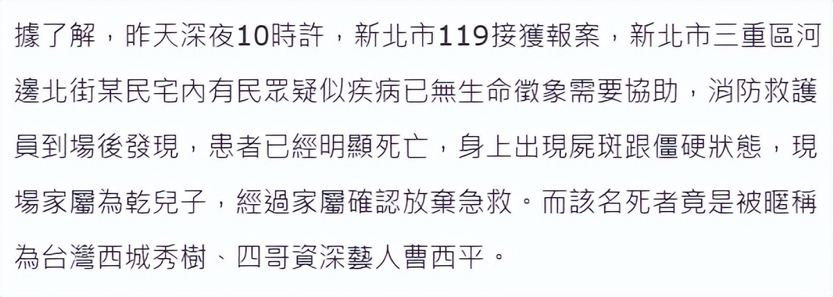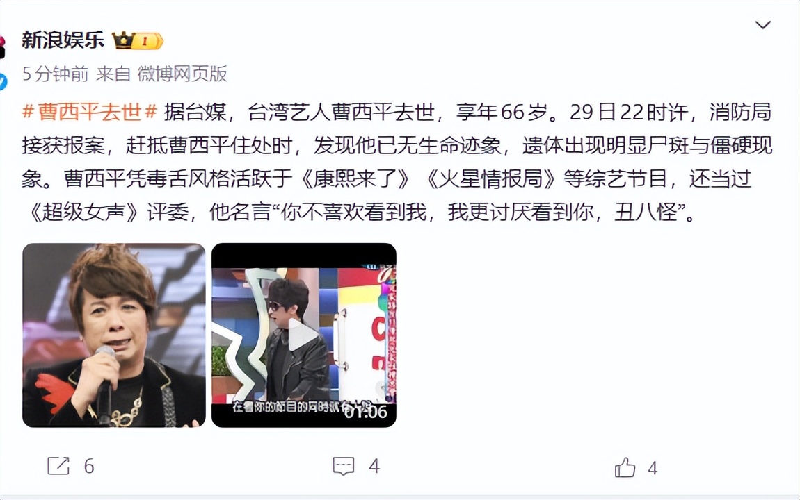 12月30日,台湾资深艺人曹西平被发现死在家中,享年66岁。