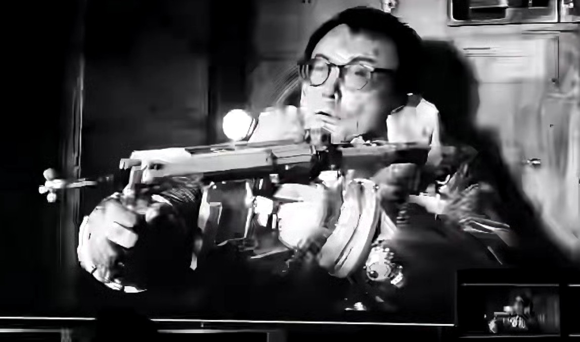 只不过与剧照中的状态完全不同,穿着一件厚重的宇航服,手里还举着枪,眼镜也换掉了。