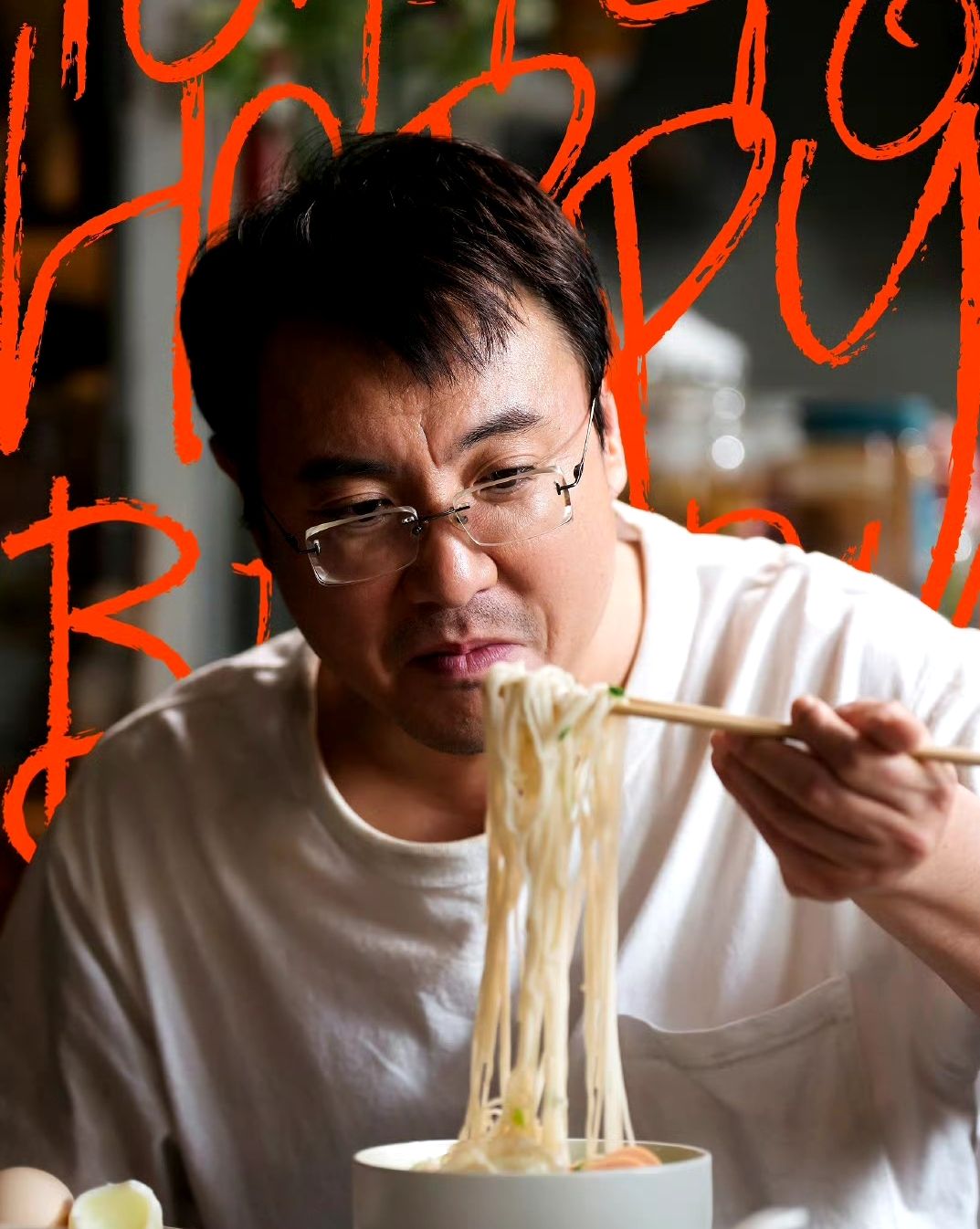 马丽穿着红毛衣,系着围裙做饭,沈腾穿着白T恤,夹着一筷子面条。