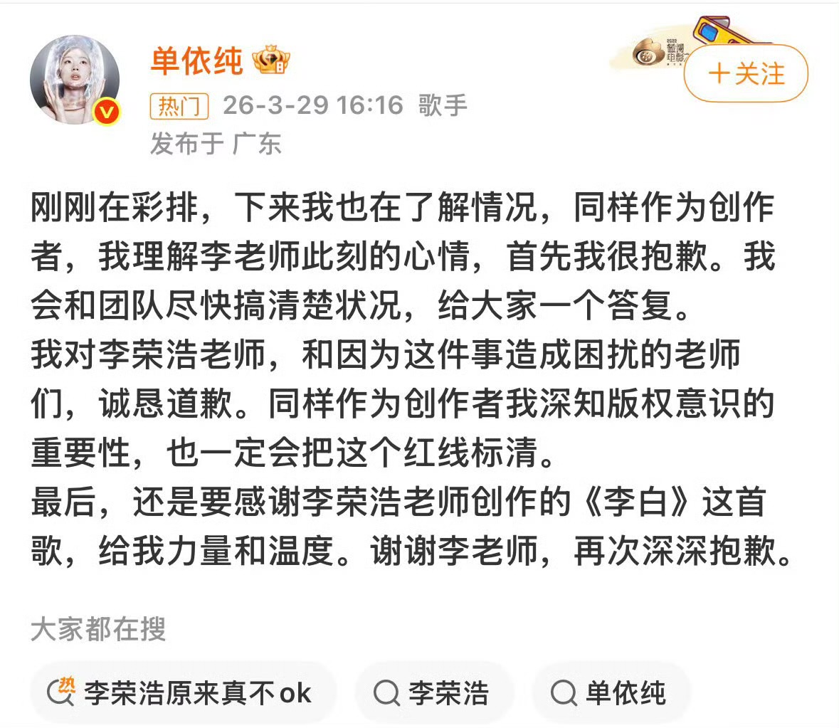 事件的核心围绕商业演出的版权授权展开,单依纯团队此前为演出曲目申请翻唱李荣浩经典作品的授权,却并未得到版权方的许可,在明确知晓未获授权的情况下,单依纯依旧在商业演出中演唱了该曲目,这一行为直接构成了版权侵权。李荣浩的四连质问,并非单纯的情绪宣泄,而是精准戳中了此次侵权事件的核心,每一句质问都直指问题本质,既是对自身原创作品权益的维护,也是对行业违规行为的严肃问责。