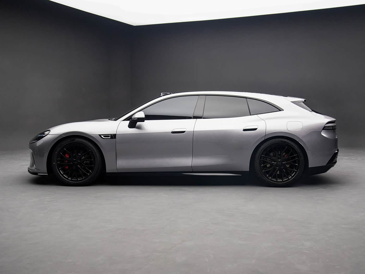 再来看车身侧面部分,以“优雅张力设计美学”为核心,打造出兼具超跑姿态与猎装格调的视觉盛宴。车身尺寸为5050/1980/1470mm,搭配3000mm超长轴距,既保障了车内宽敞的乘坐空间,又勾勒出修长流畅的车身线条。并且新车低趴宽体的超跑姿态,整车呈现出“极致修长、极致低趴、肌肉张力、流畅轻逸”的视觉效果。此外,车尾采用百万跑车级宽体后轮包设计,配合275mm超宽后轮胎宽,肌肉轮廓饱满有力,营造出媲美百万超跑的运动气场,打破家用猎装的平淡刻板印象。