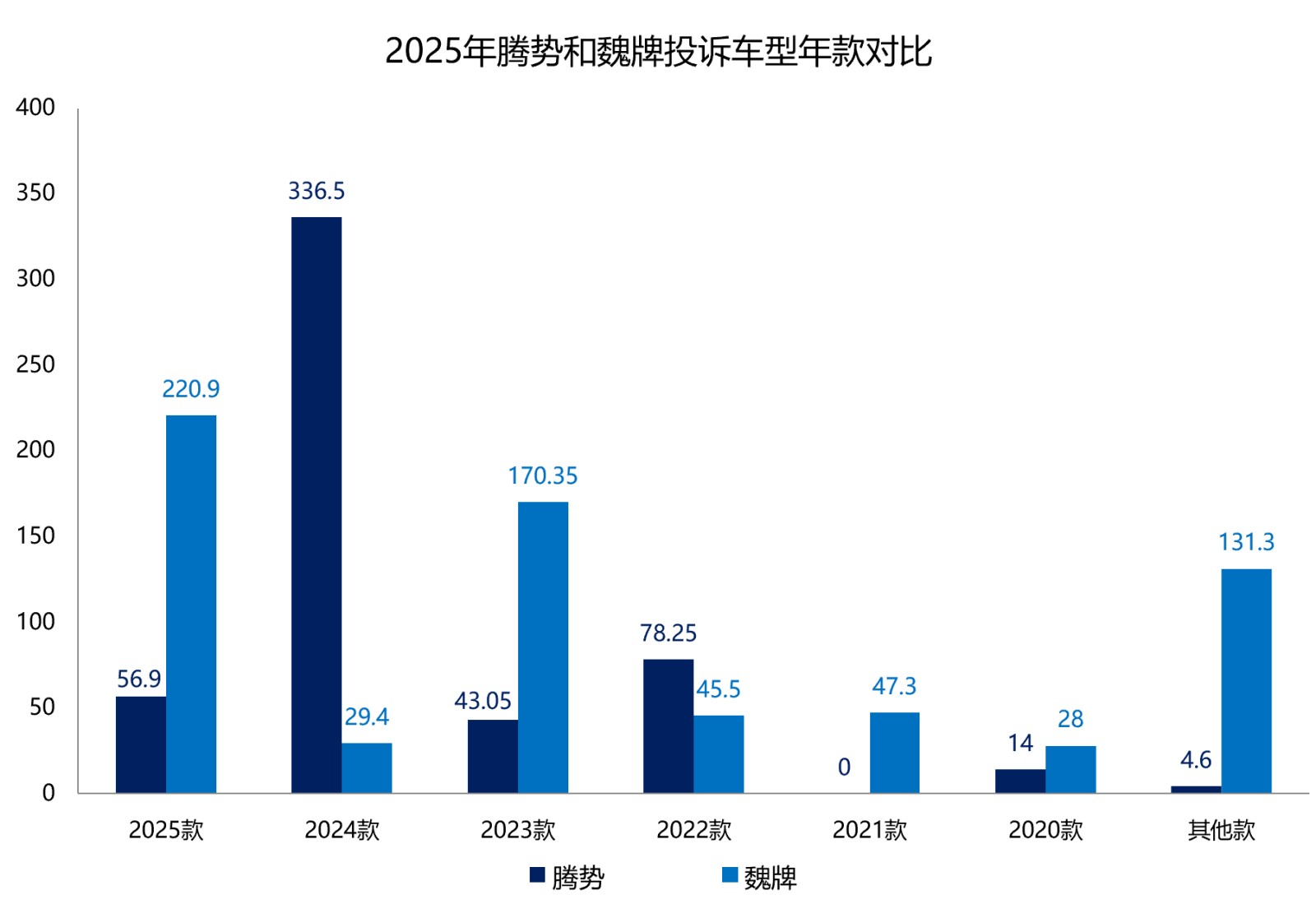 腾势投诉呈现单点爆发、集中度极高的特点,而魏牌则是多代车型共同贡献、分布更为分散的投诉格局,两者的年款投诉结构差异显著。