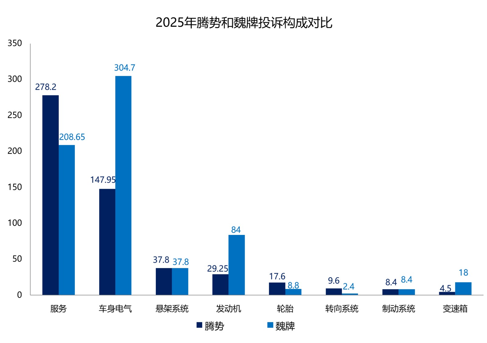 腾势和魏牌的投诉均集中在服务与车身电气两大领域,但结构侧重有所不同。其中,腾势的投诉指数以服务类投诉为主,占比达到了52%;车身电气投诉指数为147.95,占整体投诉指数的28%。魏牌则呈现出相反结构,其车身电气投诉指数占比更高,达到了45%,服务类投诉占31%。此外,魏牌亦存在少量发动机相关投诉,但整体投诉量并不高。