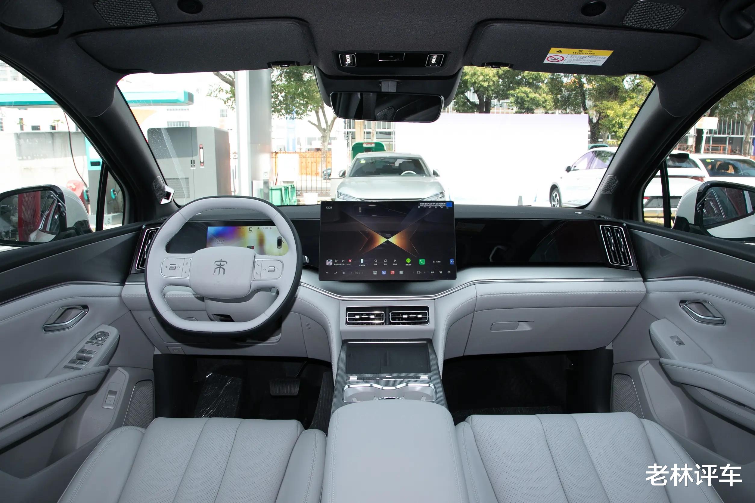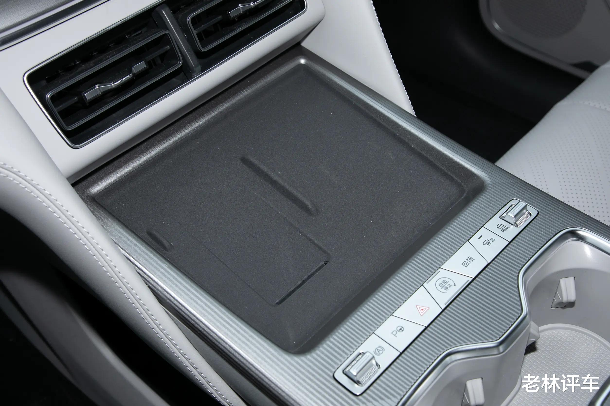 内饰方面,这款车所营造的豪华氛围和科技氛围还是很不错的,配备了10.25英寸液晶仪表盘+15.6英寸中控屏幕+26英寸W-HUD投屏,DiLink系统支持卫星导航、四区域语音识别控制、面部识别、5G车联网、手机APP远程功能和OTA升级等,前排还标配50W手机无线充电面板。