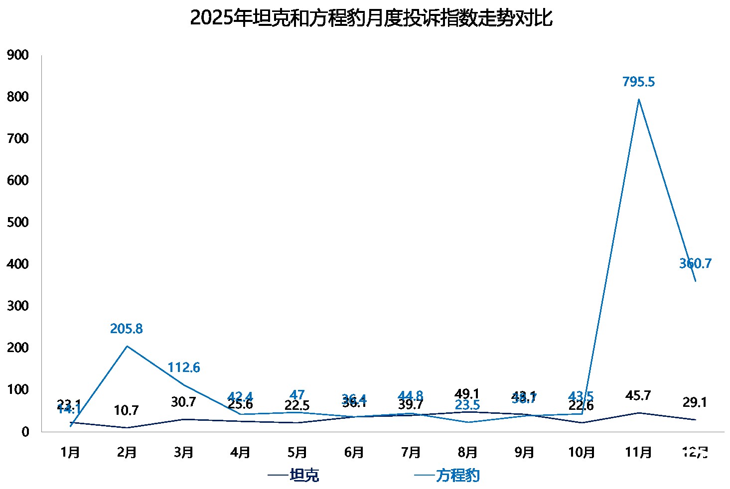 作为两个深受消费者喜爱的硬派越野品牌,坦克和方程豹在销量相仿的背景下,投诉指数出现了较大差异。2025年,坦克品牌的投诉指数整体运行平稳,方程豹则遭遇了两次集中投诉,投诉指数远高于坦克品牌。当然,身为一个年轻品牌,方程豹初期出现产品问题并不断改进属于常情。若抛开这两次集中投诉,坦克和方程豹的投诉指数均展现了极低的水准。