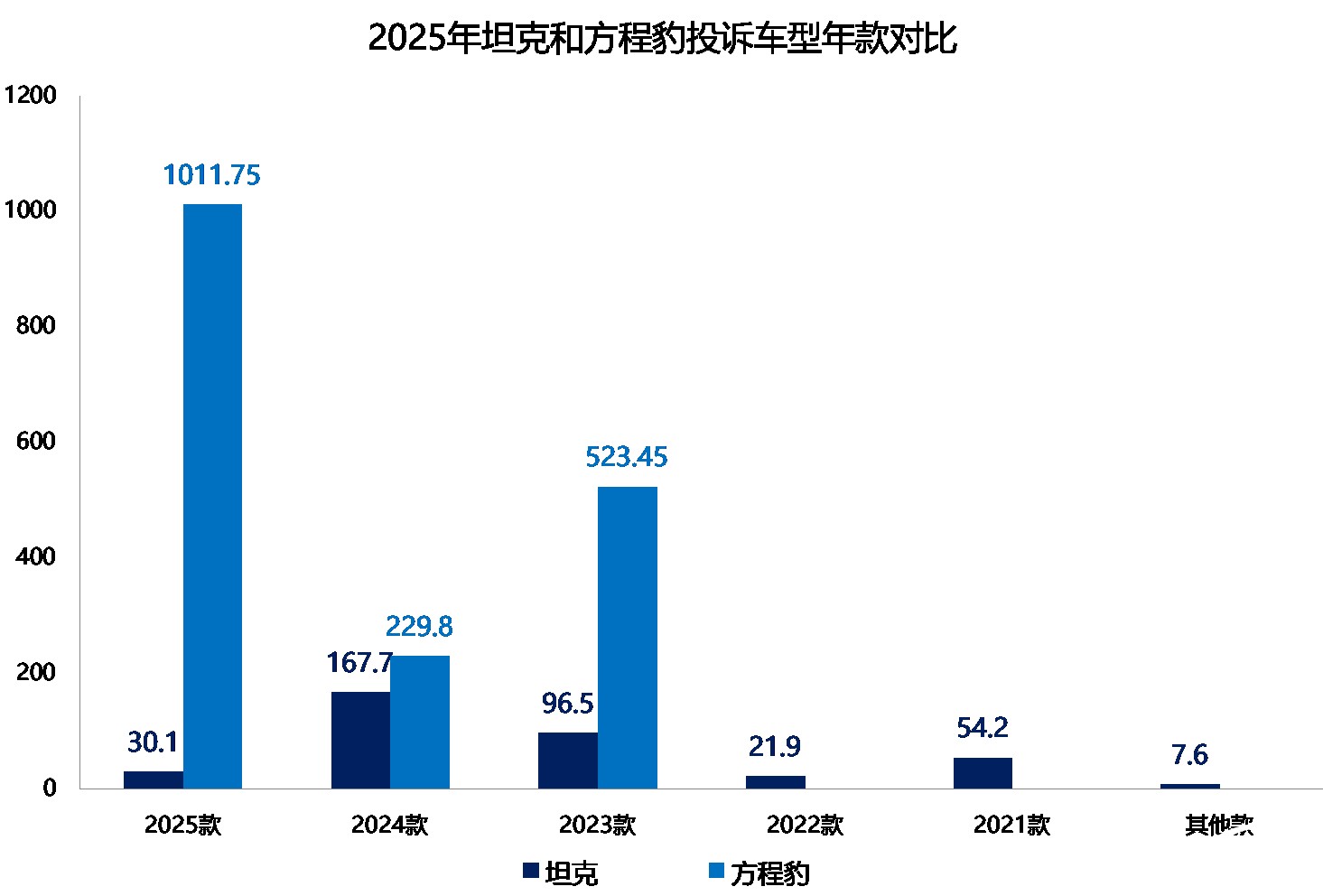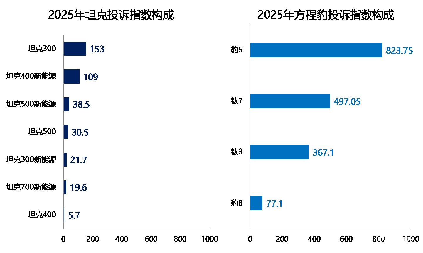 首先来聊聊销量。官方信息显示,2025年,坦克累计售出了232713辆新车;方程豹全年售出了234637辆新车,比坦克多卖了近2000辆。整体上,两个品牌在伯仲之间。从投诉指数上看,2025年,坦克的投诉指数为378,方程豹的年度投诉指数达到了1765,超过了坦克的三倍。这么来看,方程豹的产品投诉率远高于坦克。