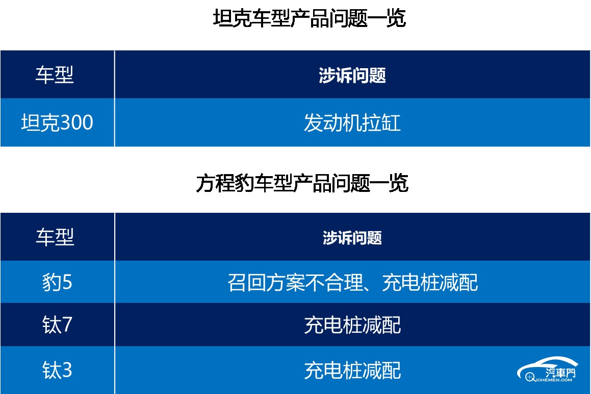 其中,2025款车型的集中问题主要是钛7、钛3和豹5充电桩减配;2023款车型的核心问题在于豹5的找回方案不合理。坦克的投诉问题比较分散,并未出现大规模集中投诉。只是2023款坦克300发动机拉缸问题遭遇多起投诉。