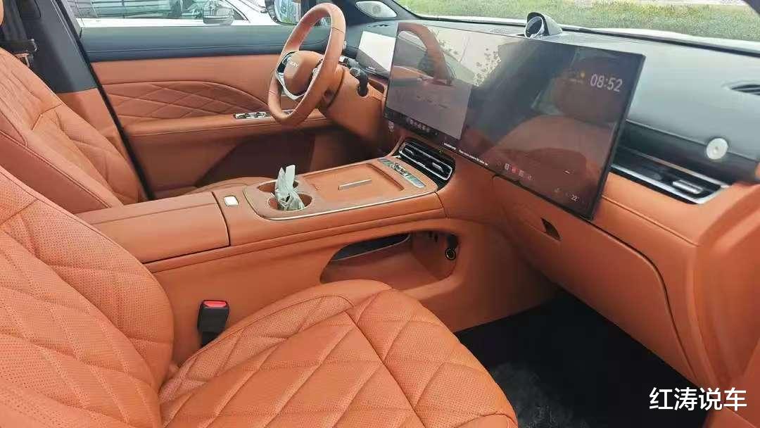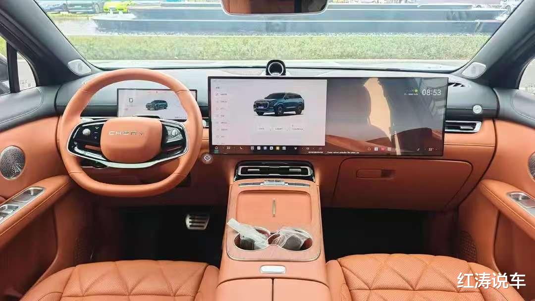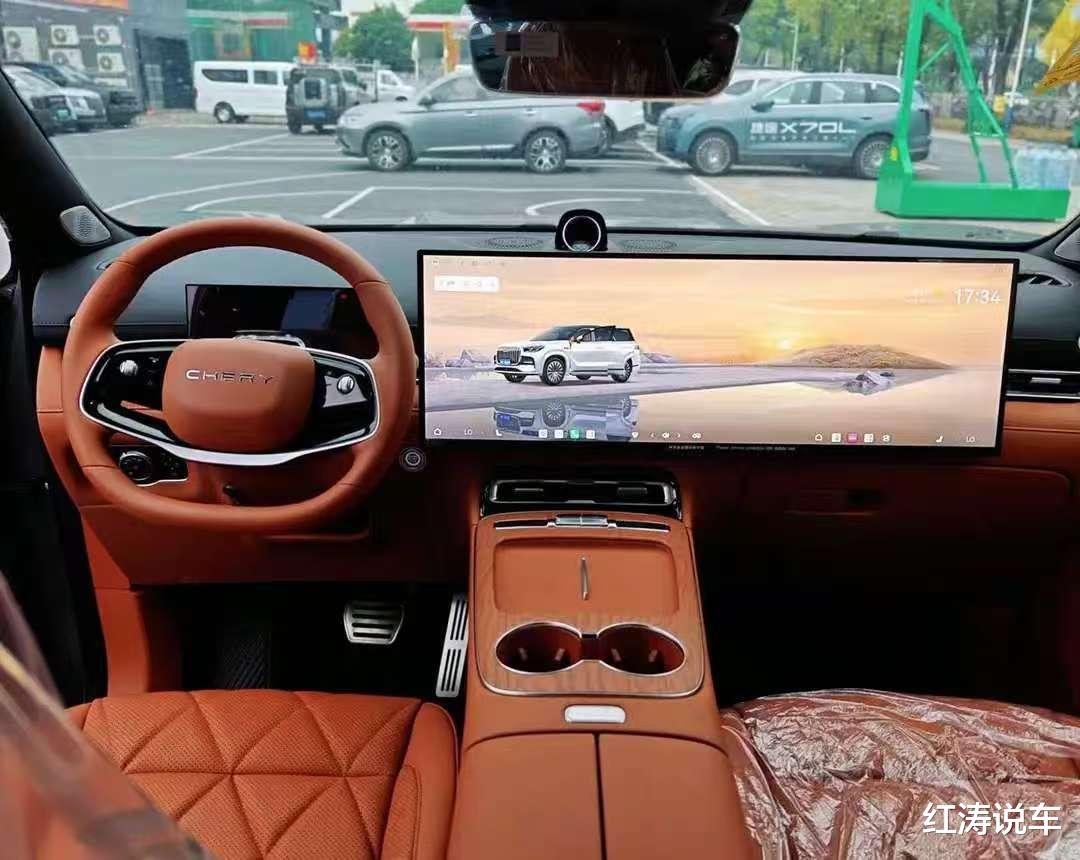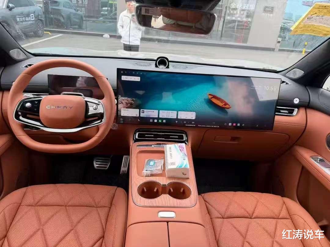 全新瑞虎9的内饰变化要比外观更大,采用家族最新设计风格,车内大量软性材质覆盖和皮质包裹,配备30英寸6K一体式寰宇屏,车机使用高通骁龙8255座舱芯片,提供自研灵犀智能体,采用电子怀挡,副仪表台提供50瓦手机无线充电、双杯托、对开式扶手箱等。