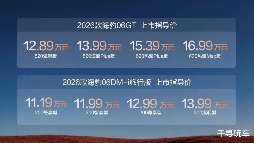 2026款海豹06GT官方指导价12.89-16.99万元,起售价较老款下调8000元。2026款海豹06DM-i旅行版官方指导价11.19-13.99 万元,看似微涨,但起步就是200km,和老款150km续航相比还降了8000元呢。而且配置多了激光雷达、闪充、云辇-C、240kW电机(GT)、300km续航(旅行版)……相当于加量不加价。