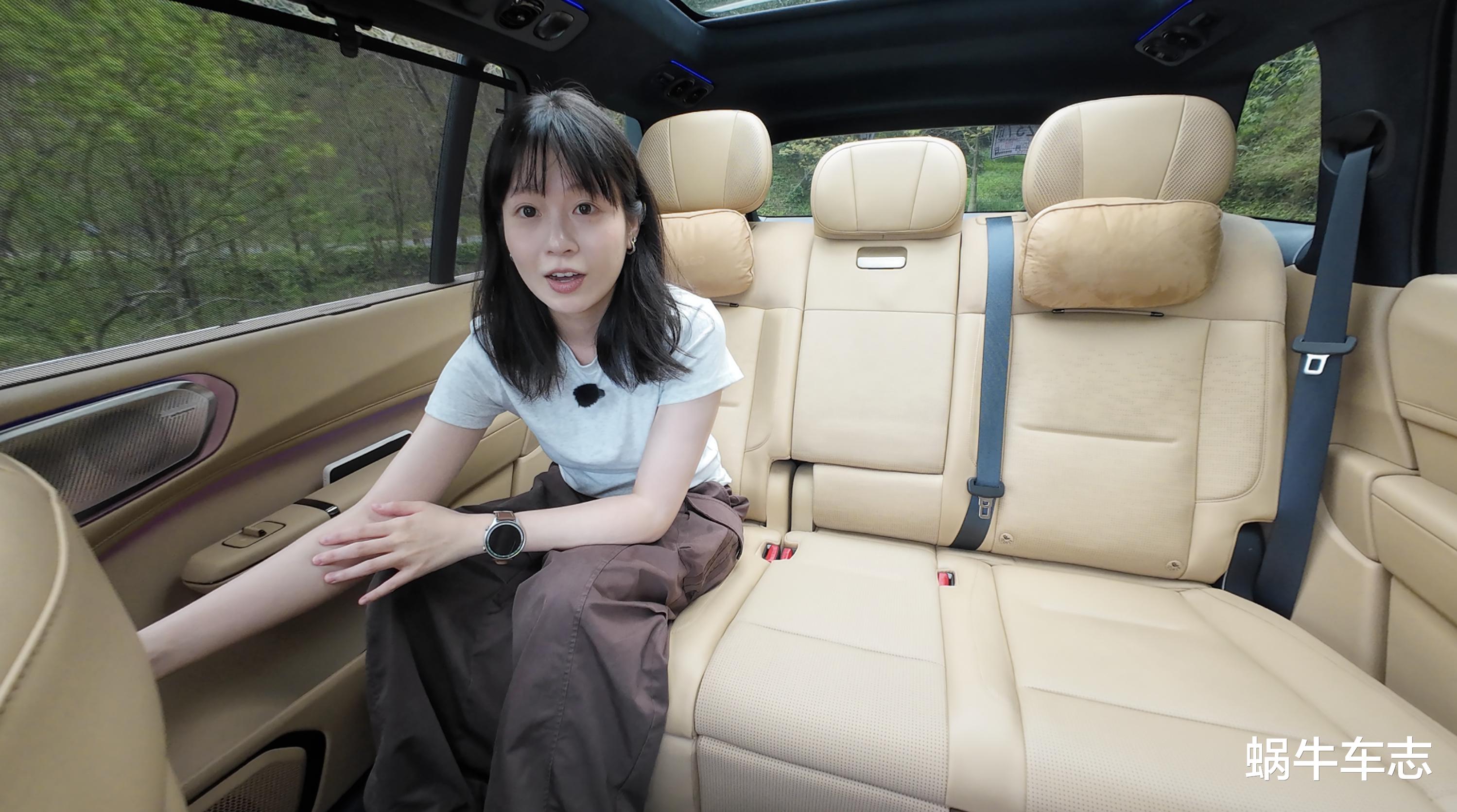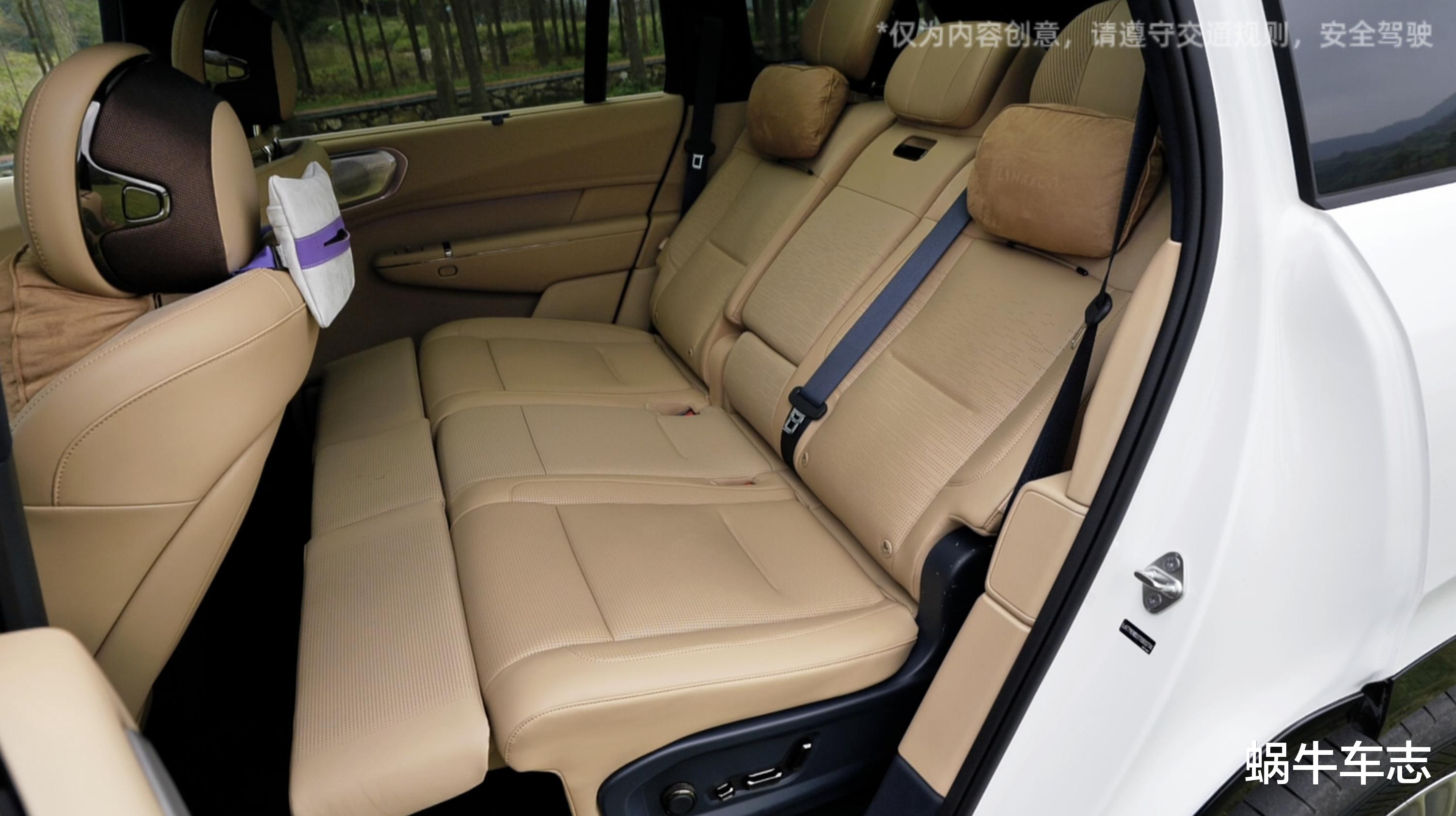 领克900加入了大五座新车型,它的车长达5240mm,轴距为3160mm。这个尺寸原来给六座,现在改成五座,可想而知座舱得房率有多夸张,高达88.2%。整个大后排已经需要我们去量尺寸了,它有几个有意思的点:首先是二排角度最大可调节到150度,并配合一键腿托,这个“老板位”就相当有排面了;其次是它支持很强的16点按摩功能;此外,它还有一个儿童床模式,一键启动二排形成一张1.35米x0.85米儿童床。出去露营,小孩睡着了,这个模式恰到好处。