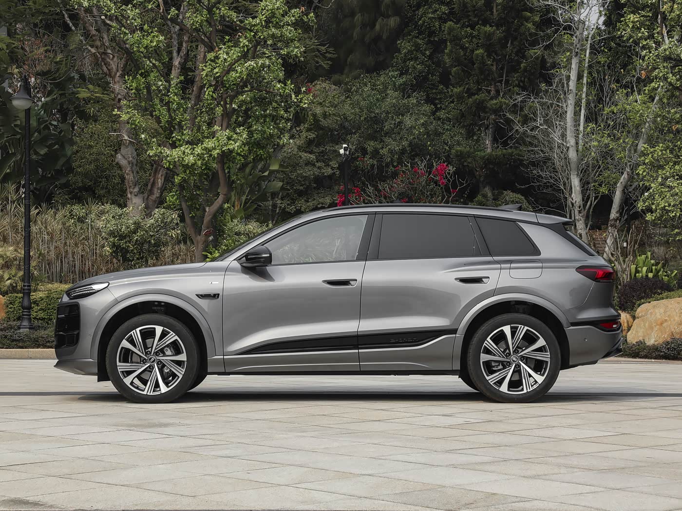 再来看车身侧面部分,奥迪Q6L e-tron的长宽高分别为4884/1965/1691mm,轴距达到2995mm,相比海外版加长105mm,修长的车身搭配流畅的线条,营造出优雅大气的视觉效果。侧面采用内嵌式门把手,有效降低风阻,半封闭式空气动力学轮辋进一步优化了整车的空气性能。前窄后宽的轮胎配置(前255mm/后285mm),既保证了转向灵活性,又提升了后轮抓地力。车身侧面的腰线从前翼子板贯穿至车尾,搭配微微上扬的窗线,让整车看起来动感十足。同时,2995mm的超长轴距为车内空间奠定了良好基础,满足家庭用户的出行需求。