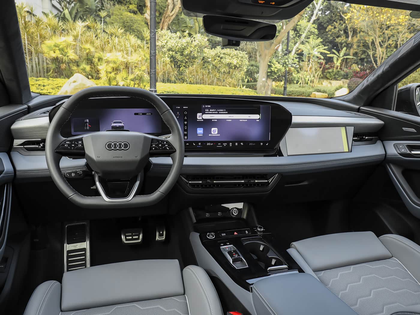 进入车内,内饰主打奥迪新一代数字化豪华座舱,中控台采用11.9英寸液晶仪表 + 14.5英寸悬浮中控屏 + 10.9英寸副驾娱乐屏 + 88英寸 AR-HUD的四联屏布局,搭载 E³ 1.2 电子电气架构 + 骁龙 8155 芯片,操作流畅、多屏联动,支持540°全景影像、AI 语音交互、车载娱乐全生态,智能体验全面升级。方向盘为三幅式真皮多功能,带触控按键 + 换挡拨片,握感扎实;电子换挡 + 悬浮式中央扶手,释放储物空间,空间方面,2995mm超长轴距带来越级5座布局,前排运动座椅采用加厚海绵(+18mm),支持12向电动调节、加热 / 通风 / 按摩,包裹性与支撑性拉满。