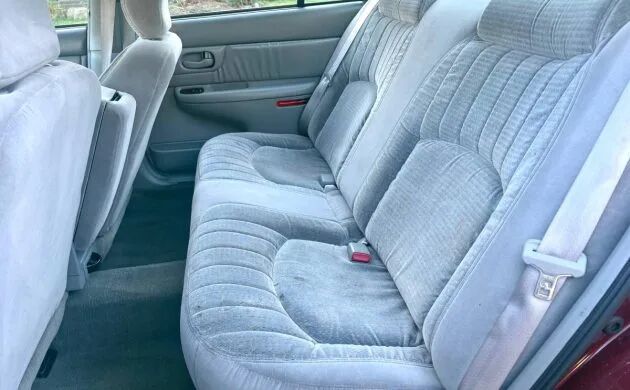 别克在1996年12月推出第六代世纪系列,作为1997款车型上市,车身尺寸相比上一代明显加大,设计重点放在提升乘坐舒适性与后备箱空间上,是典型的90年代美式家用轿车风格。这台1998款世纪Custom从经销商展厅开出后便一直属于同一个家庭,车漆选用当年颇为高级的波尔多红珍珠漆,在精心养护下依旧呈现镜面般的光泽,车身线条笔直流畅,完全没有锈蚀或明显瑕疵,塑料饰件、玻璃以及轮毂盖均保持完好,没有剐蹭、磕碰或老化褪色,整体观感远远优于同年限的普通代步车。