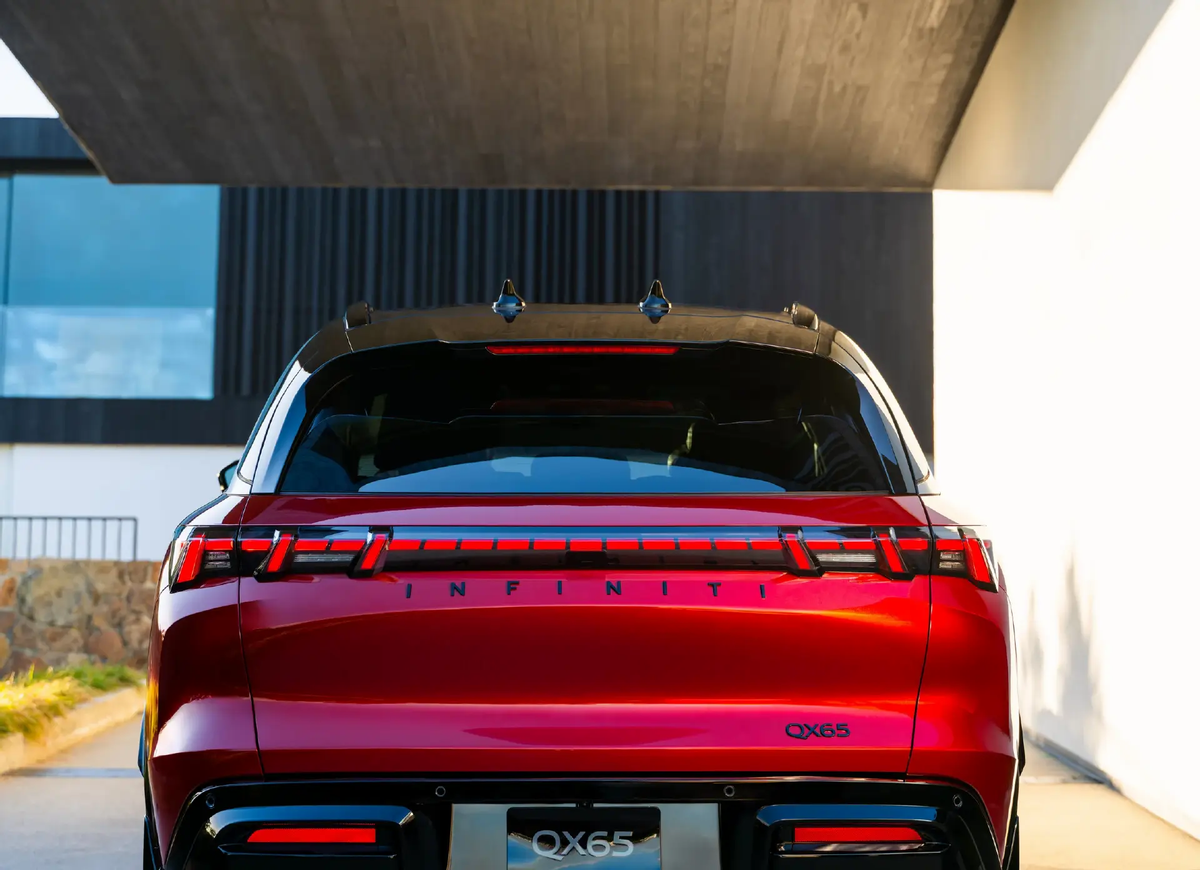 从车尾角度看,英菲尼迪QX65好像有种熟悉感,特别是在尾灯造型上,无论是间断式点阵灯珠,还是两侧的刹车灯、转向灯设计,它都会让我想起领克Z10。此外,英菲尼迪QX65的后保险杠也采用了大面积烤漆包围的立体结构,这一点也跟一些国产车当下的处置类似。