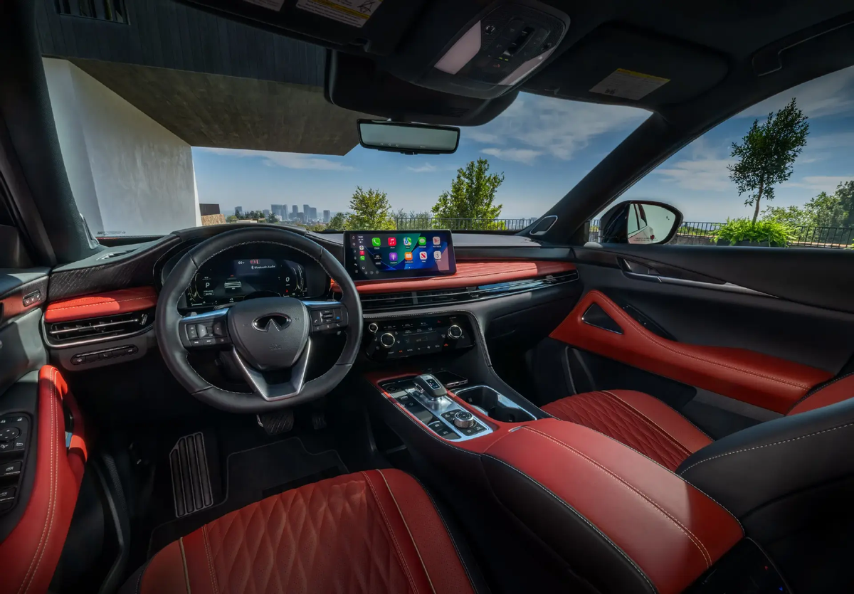 进入到驾驶舱,说实话,作为QX60在运动方向上的延续,英菲尼迪QX65应该说是豪华有余,而科技不足。车辆依旧使用着偏向于驾驶人的重心偏转中控台,但无论是嵌入式12.3英寸仪表盘、长条状12.3英寸悬浮屏,还是10.8英寸HUD抬头显示,它们在规格上都已经落后于主流市场。当然,这里确实有无线充电板、64色车载氛围灯、覆盖头枕的20扬声器Klipsch音响以及主动降噪等技术,就算顶配还用上了能在高速上完成加减速、变道辅助等操作的ProPILOT Assist 2.1,可这智能化方面终归还是差点儿意思。