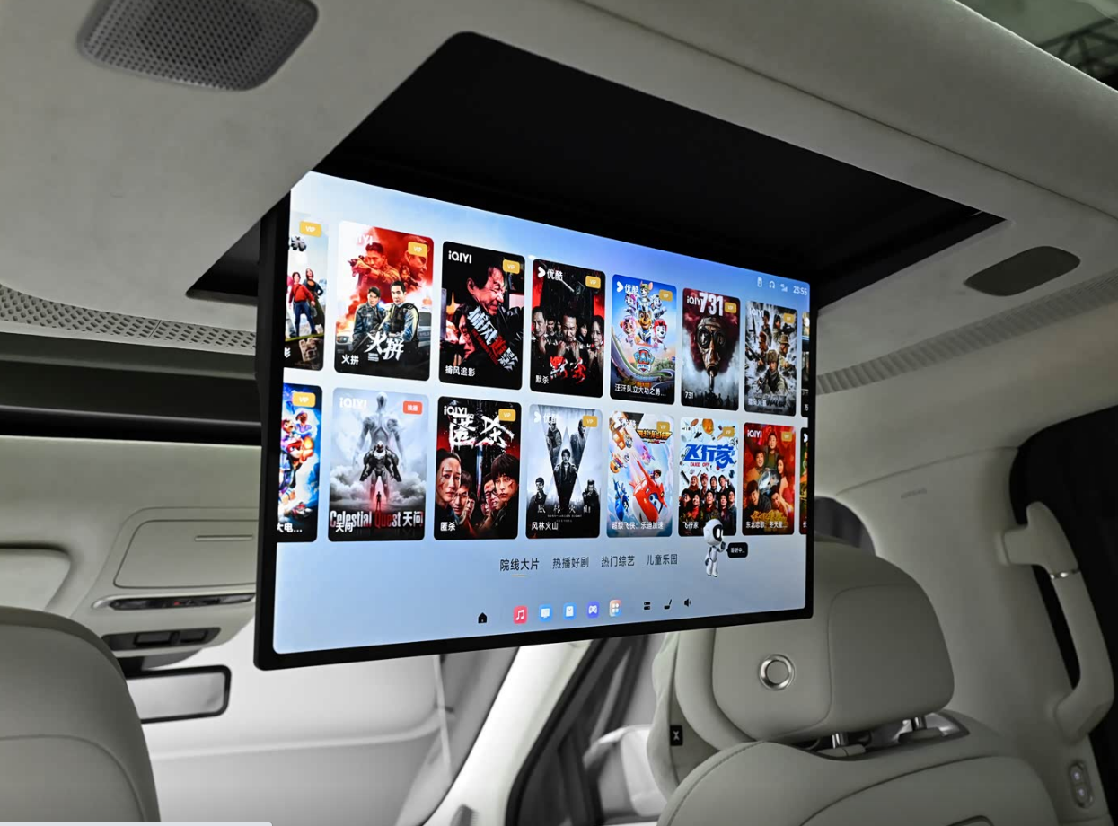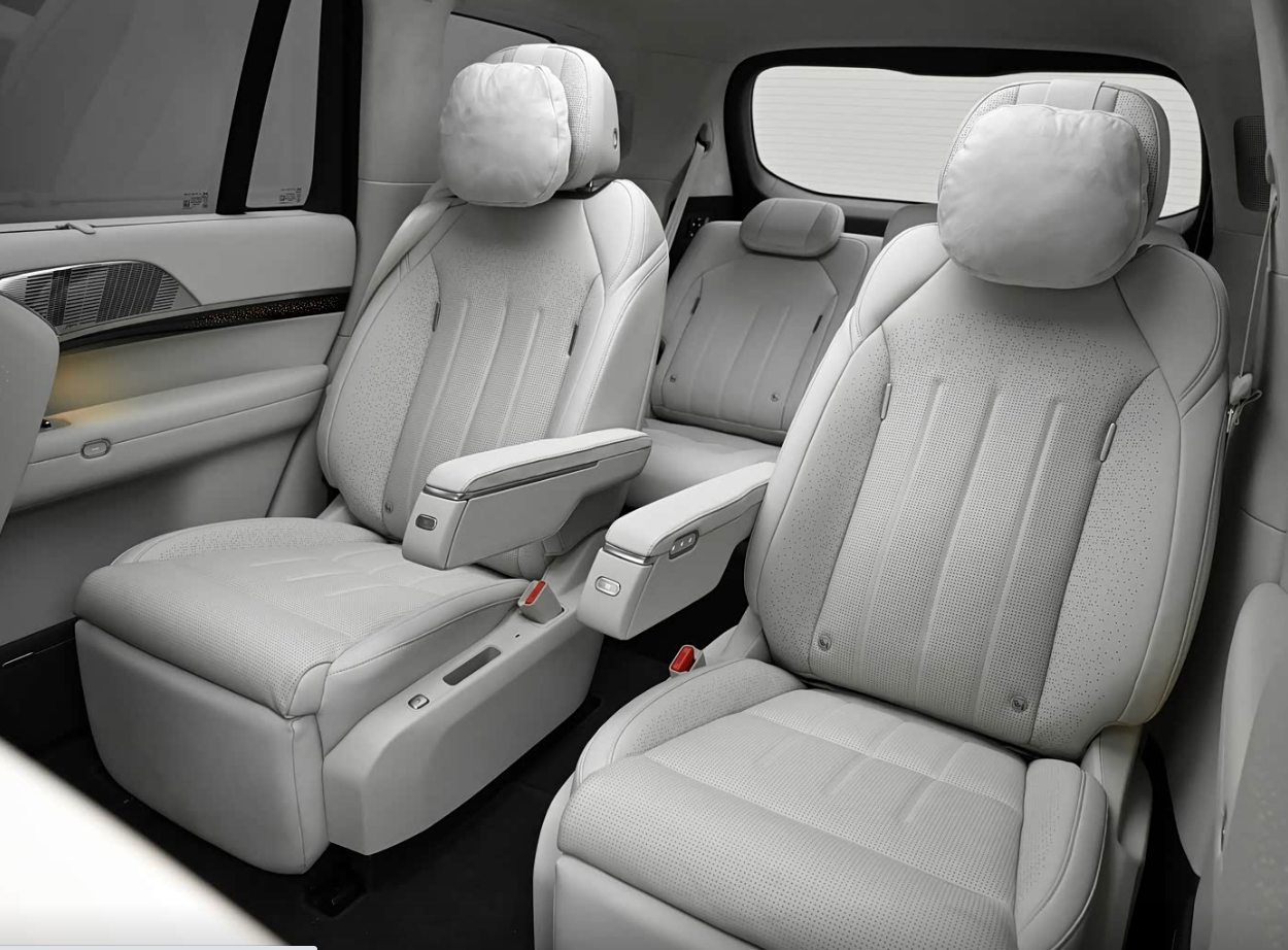 走进车内,内饰的设计上它就非常的简洁了,依旧是典型的悬浮式显示屏,配上一个尺寸比较长条的全液晶仪表,这个长条的液晶仪表和那个蔚来ES8有那么一点点相似。其次,这款车型的配置非常丰富,这款车型采用的是双辐式多功能线性方向盘,搭配有17.3英寸3K的悬浮式中控屏以及星辰缎带氛围灯造型。不仅如此,该车还配备领航悬浮中岛,其拥有智能升降充电面板以及隐藏式升降杯托。后排拥有悬浮式的显示屏,也可以翻转的娱乐屏,左侧小桌板,右侧磁吸拓展坞。座椅配置方面,其前排座椅提供16点座椅按摩、16向电动调节、3挡通风/加热/腿托加热、将提供女王副驾零重力座椅(Nappa真皮、一键零重力舒躺)、座椅集成式安全带以及座垫气囊。