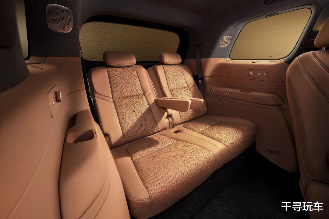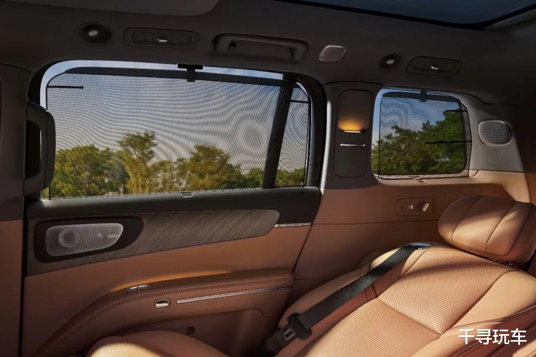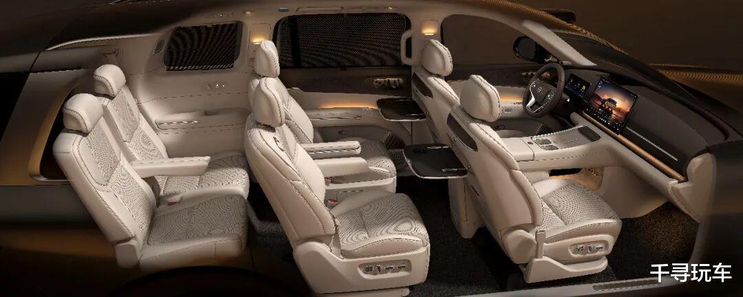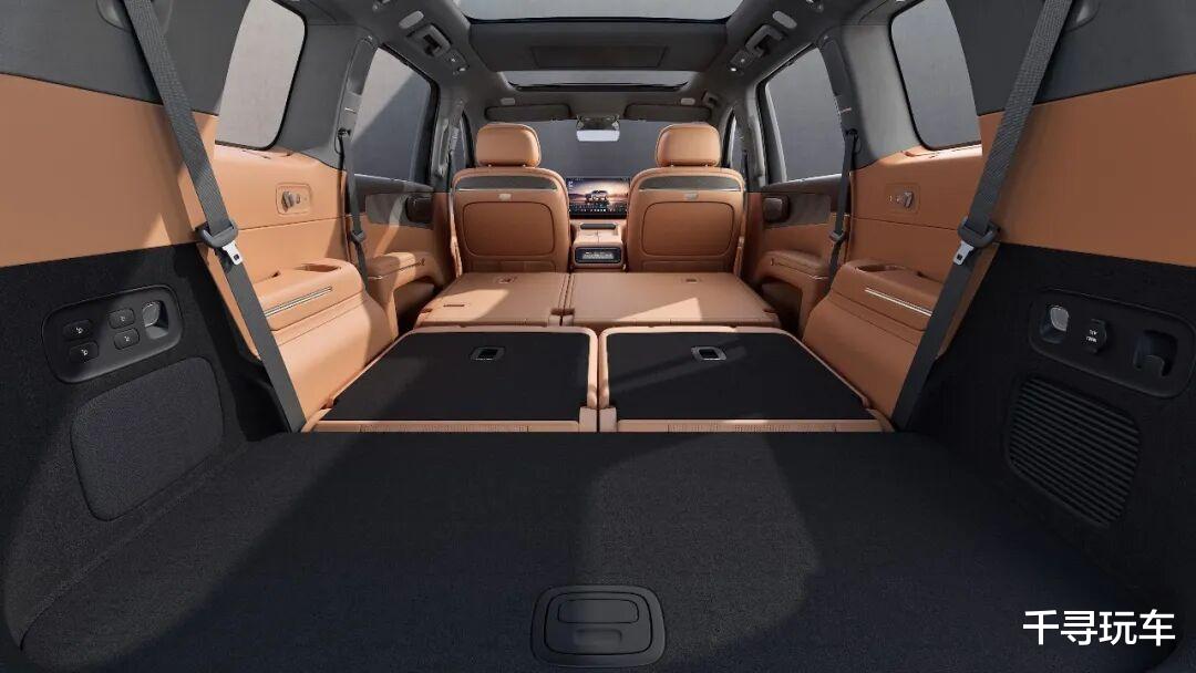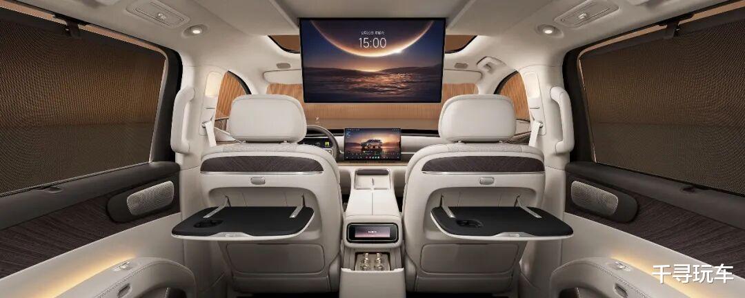 二排是真正的重头戏:120°真零重力座椅,支持通风、加热、按摩功能,配四向电动腿托,集成ABTS一体式安全带(躺姿下也能确保安全)。头顶配21.4英寸3K吸顶娱乐屏,座椅前方有双折叠桌板,中央扶手处配8.1L电动开合冷暖冰箱(-6℃到50℃)。第三排也不含糊——131°靠背无极调节,坐垫和靠背双加热,一键电动翻折。