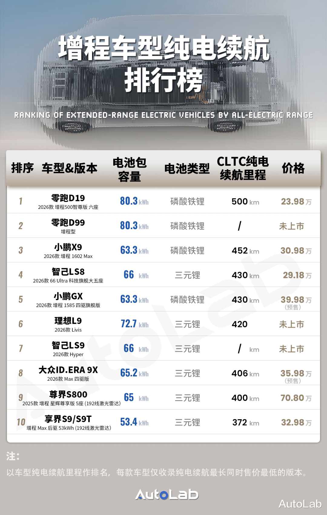 这份榜单中,纯电续航排名第一的增程车是零跑D19,500km CLTC纯电续航、80.3度磷酸铁锂电池、23.98万的定价,直接把增程混动的续航门槛拉到了新高度。