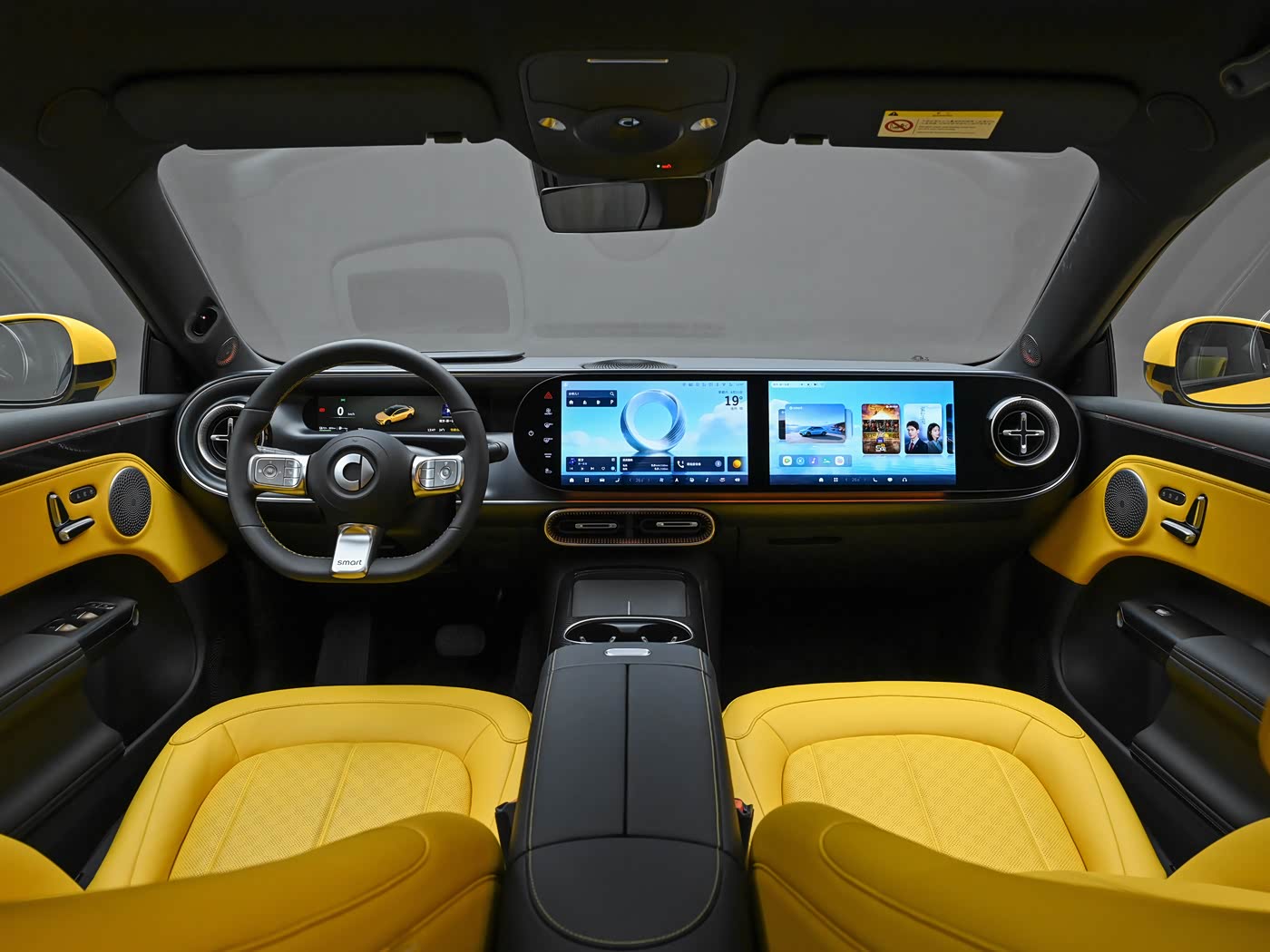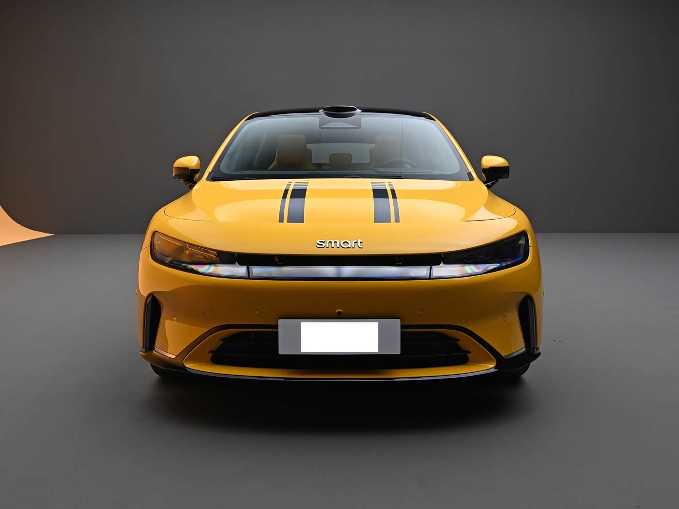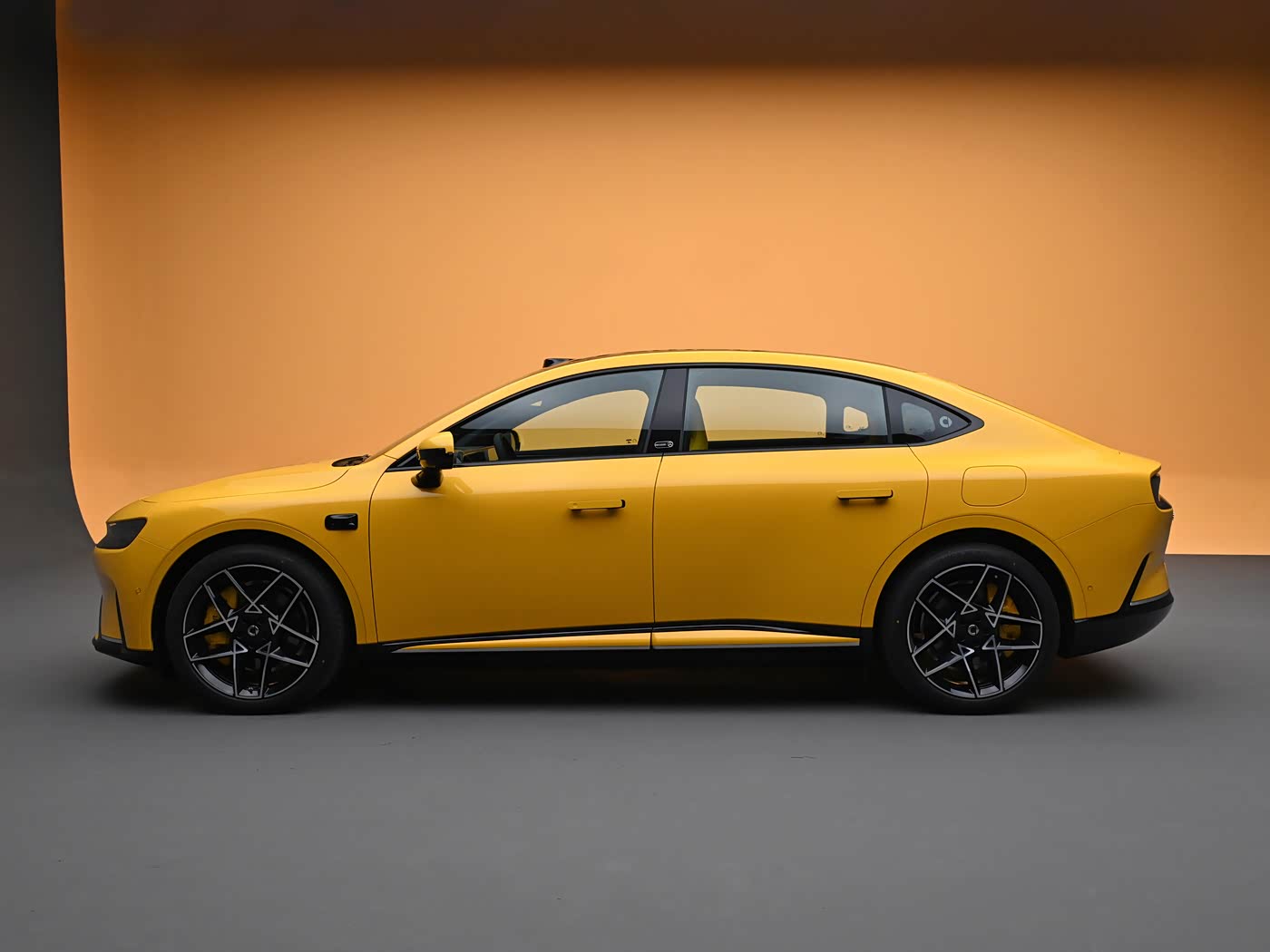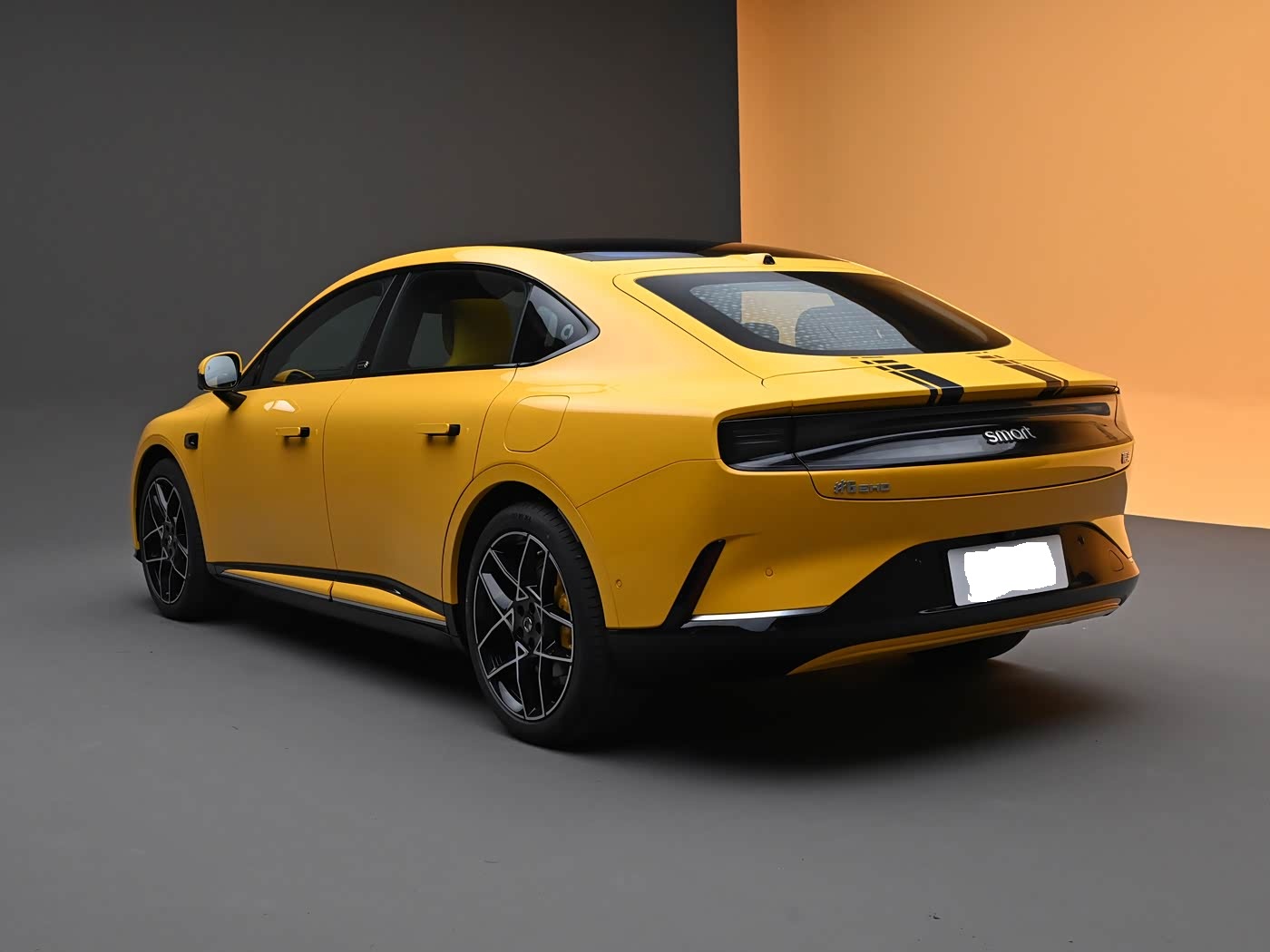 再来看车身侧面部分,精灵#6的车身尺寸为4906/1922/1508mm,轴距达2926mm,接近C级车尺寸,彻底告别了smart以往的小巧形象。经典轿跑溜背线条从B柱急速下滑,一直延伸至车尾,搭配隐藏式门把手、19/20英寸双五辐运动轮毂以及黄色高性能卡钳,让车身侧面比例修长又紧致,充满了动感与优雅。车身侧面的鲨鳍侧腰线与强壮肩线相互呼应,勾勒出流畅有力的新一代豪华掀背轿车轮廓,在降低车辆视觉重心的同时,赋予了整车丰富的层次感,实现了运动与优雅的平衡。