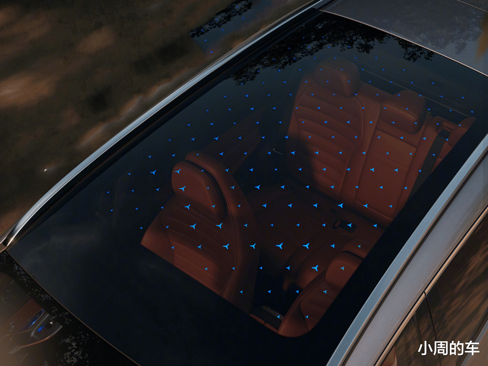 值得一提的是,这块大屏在车内人员休息时还可以呈现出水族馆和篝火等多种氛围模式,车顶的星辉全景式天幕可以实现透明、半透明以及图案三种模式,并可随着车内64色氛围灯一起律动,增加乘坐的体验感。