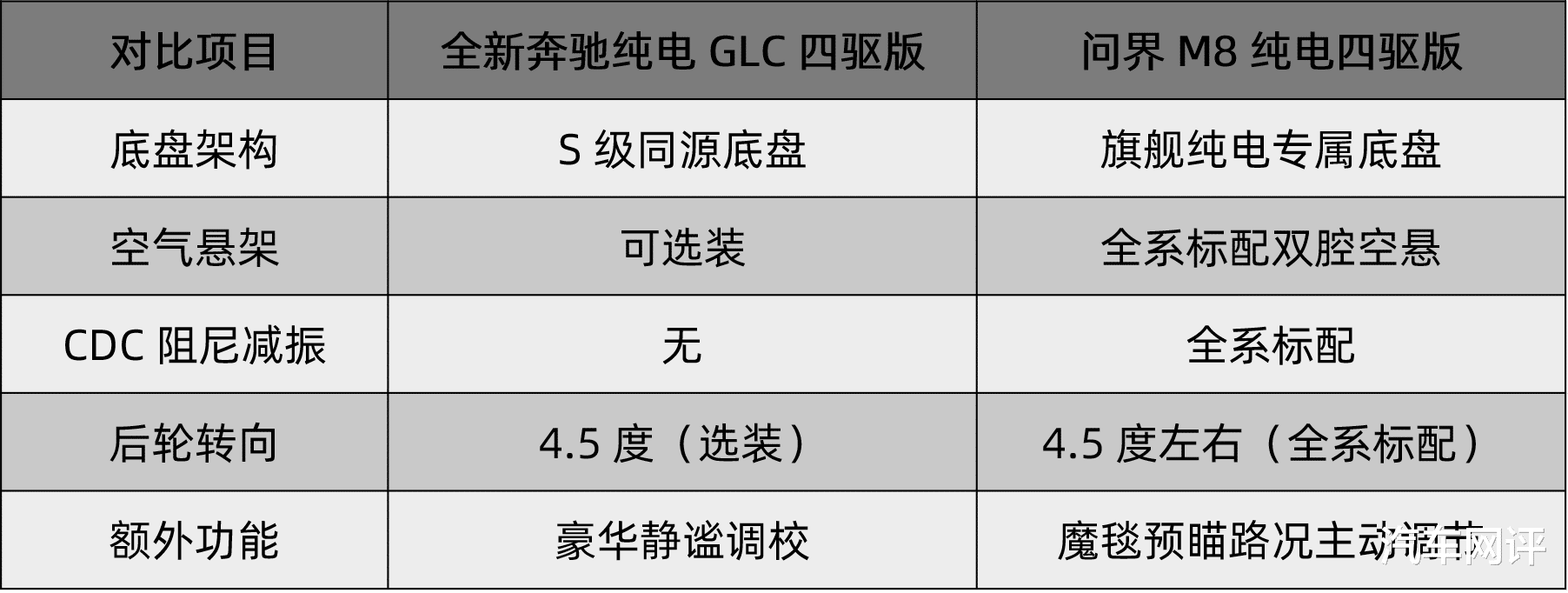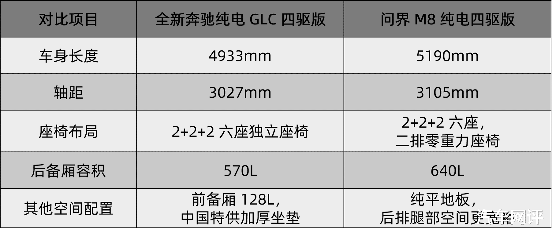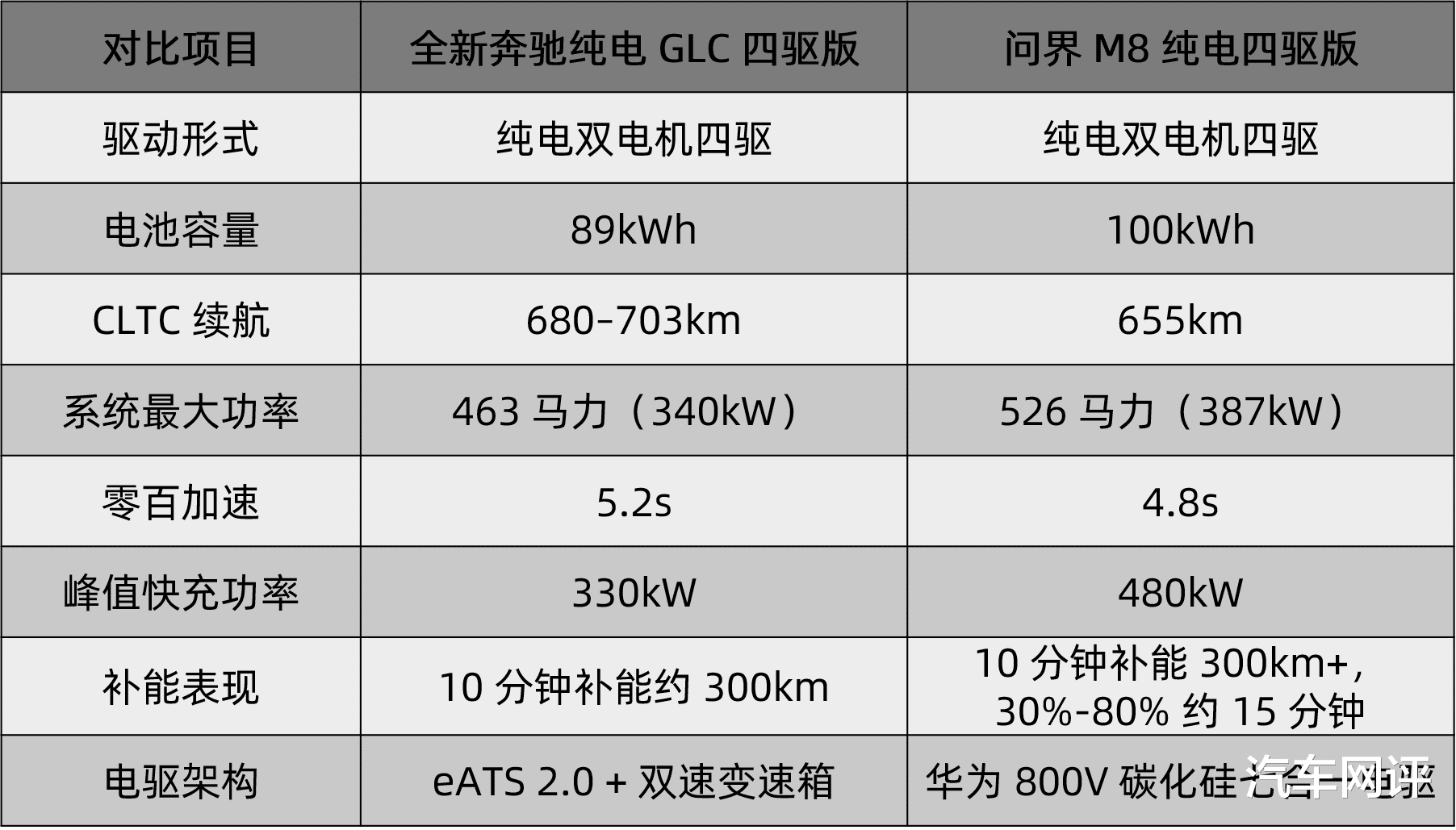 小编就用这款奔驰最大纯电GLC搭载的这些看起来十分亮眼的数据和已经上市的,价位相当的问界 M8 纯电四驱版做一下对比,看看这款预计将在下半年才上市的全新 GLC,在核心产品力层面,是否能对问界M8造成冲击。