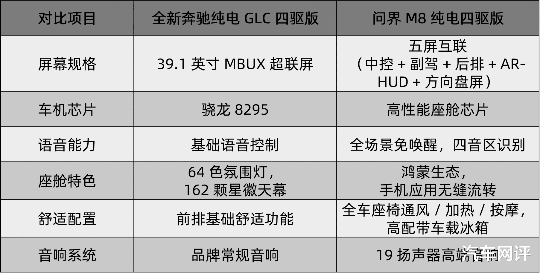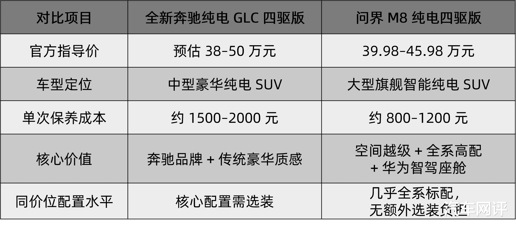 简单来说,全新 GLC 是一台做得足够好的传统豪华电动车,但问界 M8 是站在当前行业顶端的智能旗舰。在价位接近、用户高度重叠的背景下,奔驰 GLC 除品牌光环外,整体产品力并不占优,对注重实际用车体验的消费者而言,吸引力相当有限。