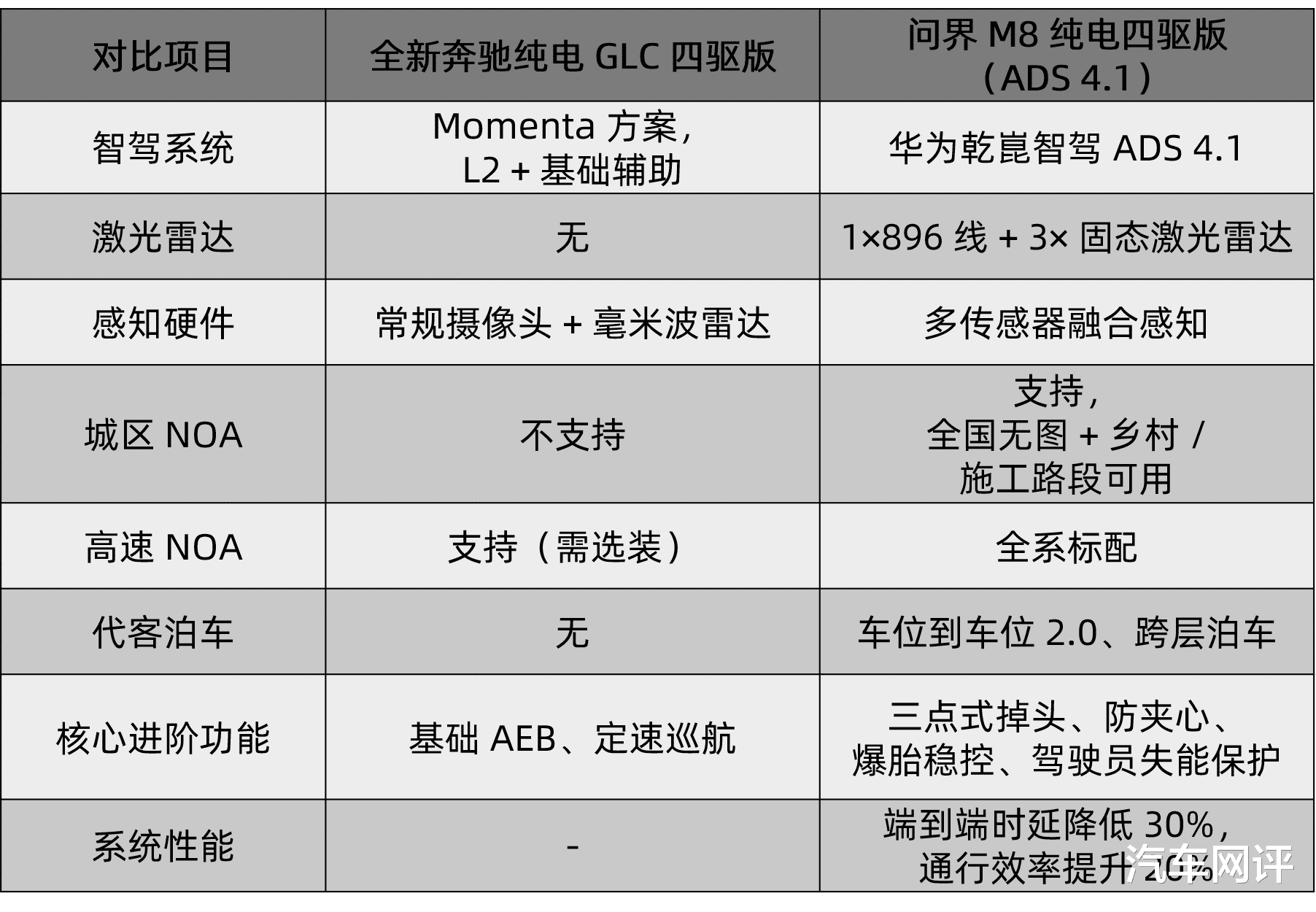 问界 M8 纯电四驱版已升级至最新华为乾崑智驾 ADS 4.1,搭载 896 线图像级激光雷达 + 三颗固态激光雷达,全系标配高阶感知硬件,实现高速、城区、乡村、代客泊车全场景智能驾驶,智驾成熟度与能力均处于行业第一梯队,与奔驰 GLC 存在明显代差。