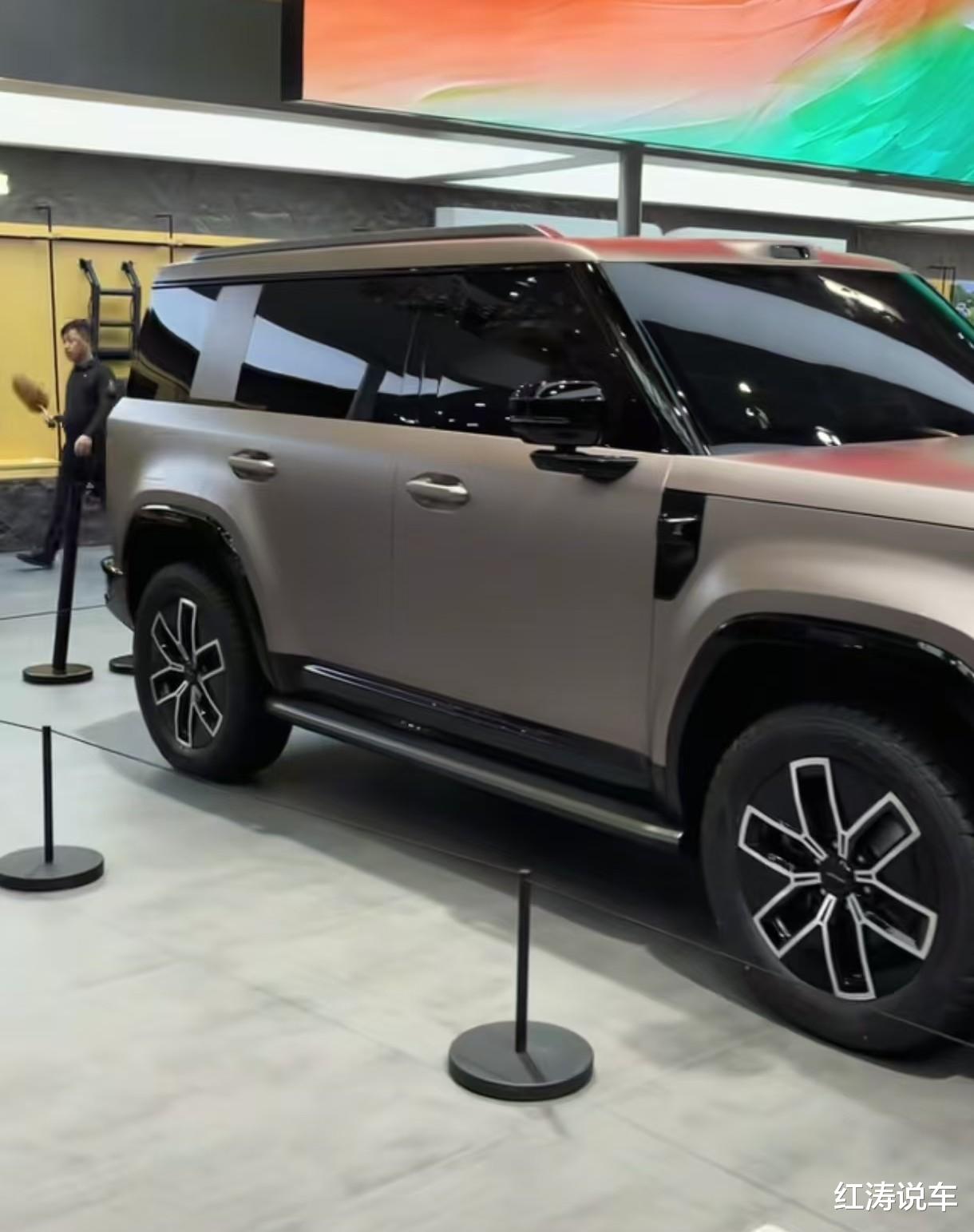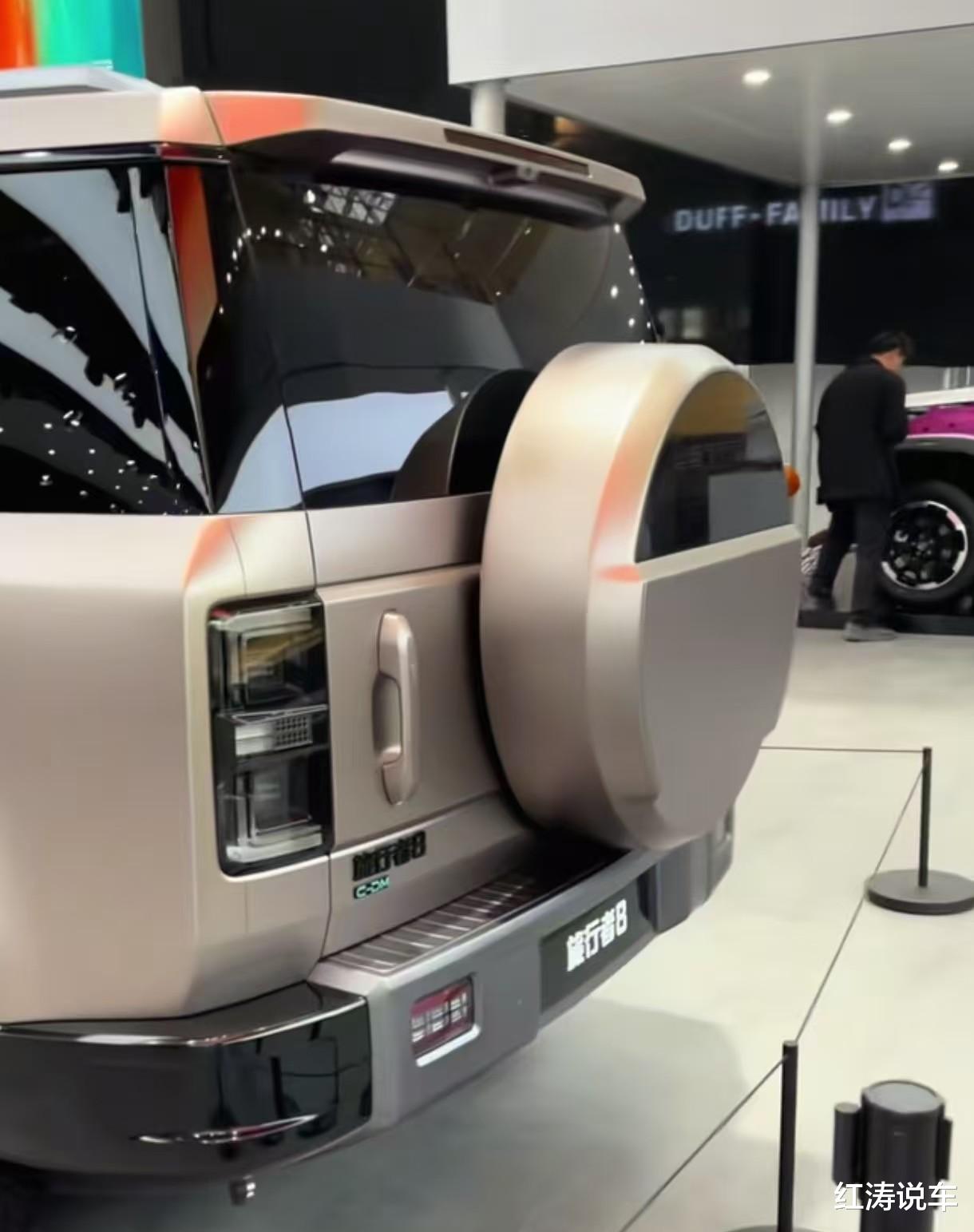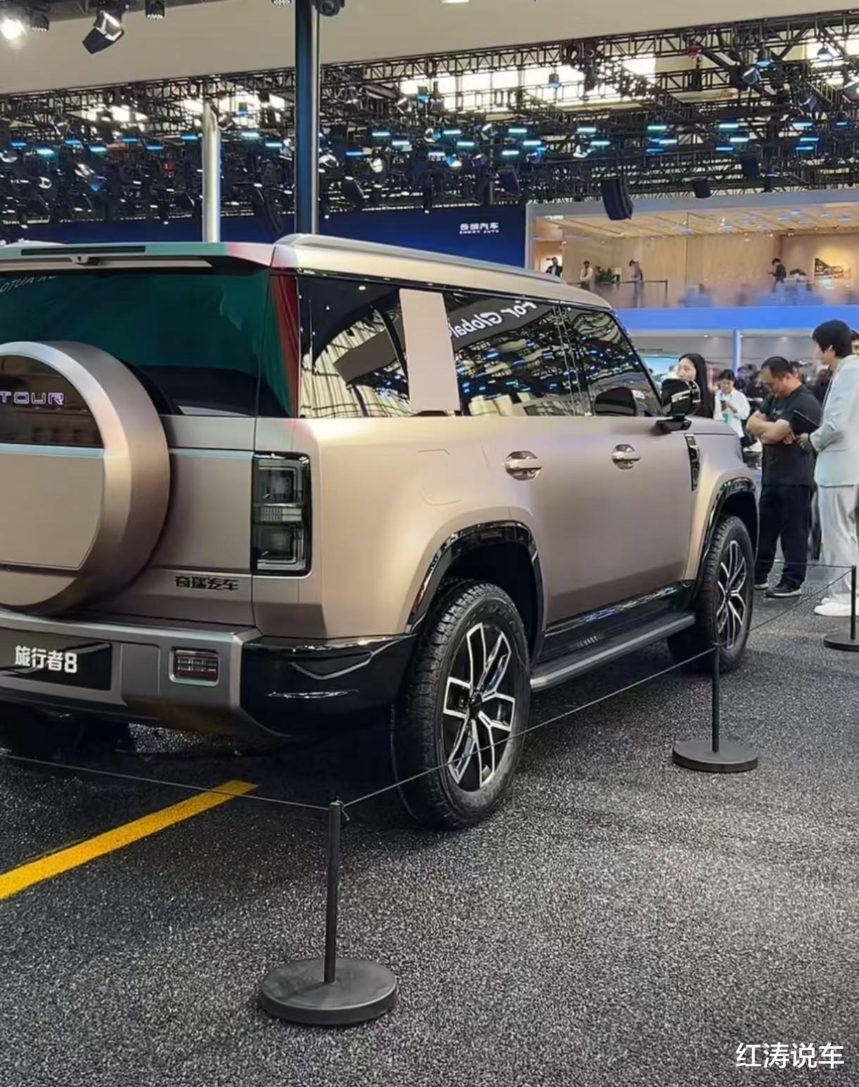 旅行者8的车长超5米,轴距近3米,这样的身材放在展台,有着一定气场,同时保障了车内宽敞的乘坐空间,悬浮式平顶是许多豪华SUV惯用的手法,前后隆起的轮拱增强了肌肉感,配备车顶行李架、侧踏板、花瓣状双色轮毂。
