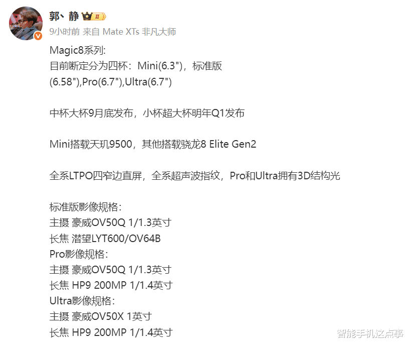 荣耀Magic8系列此次采用了明确的三机型策略,覆盖不同用户对屏幕尺寸的偏好,据爆料该系列将包括6.3英寸的Magic8 Mini、6.58英寸的标准版以及6.7英寸的Magic 8 Pro。