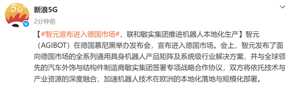 [CNMO科技消息]近日,智元(AGIBOT)在德国慕尼黑举行发布会,正式宣布进军德国市场,并推出面向当地市场的全系列通用具身机器人产品矩阵及系统级行业解决方案。发布会上,智元与全球汽车外饰与结构件领军企业敏实集团签署专项战略合作协议,双方将通过技术与产业资源的深度整合,加速机器人技术在欧洲的本地化落地与规模化应用。