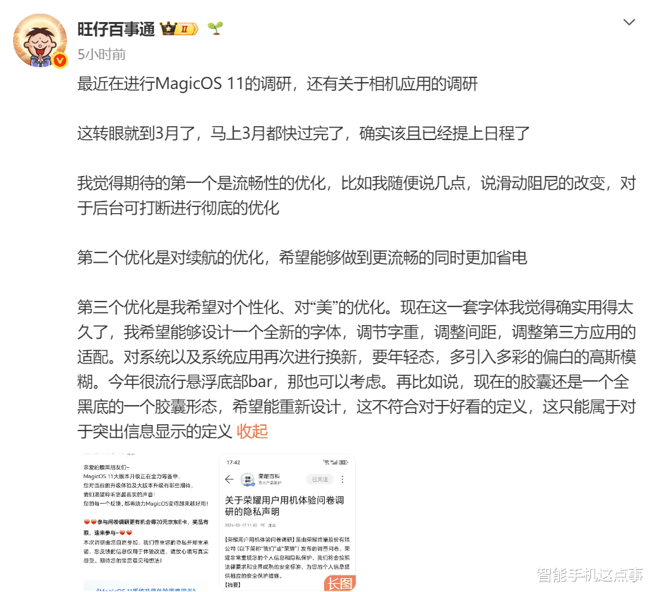 要知道荣耀产品维护与升级负责人“小芳哥”前几天放话,MagicOS 11正在全力筹备中,与此同时,关于状态栏设计、系统字体、后台动效的用户调研也悄然铺开。