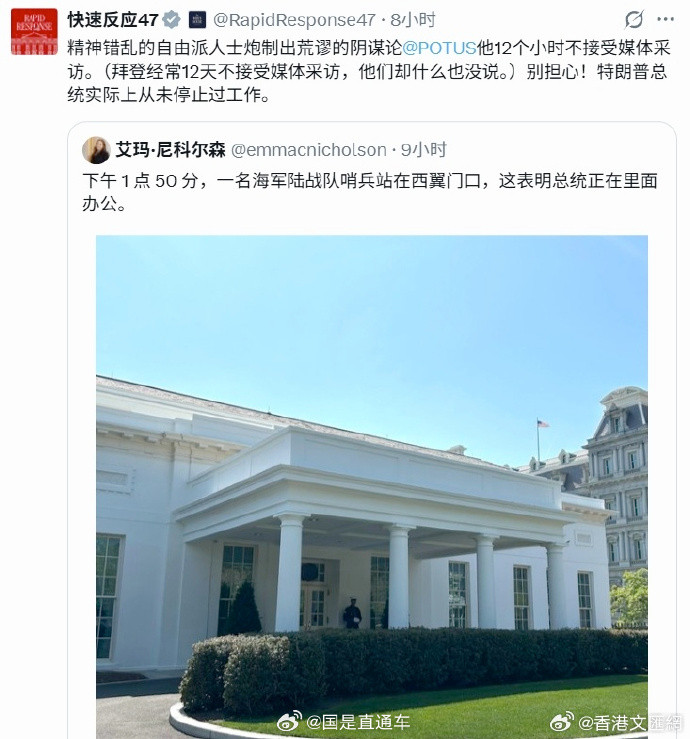 白宫也通过其官方账号“快速反应47”回应网络猜测:“当美国总统连续12小时不接受媒体采访时,那些精神错乱的自由派人士就开始编造荒谬的阴谋论。(而当拜登经常连续12天不接受媒体采访时,他们却什么也没说。)