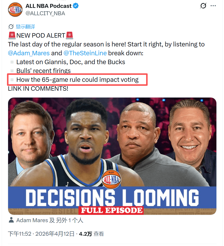 北京时间4月13日,NBA常规赛继续进行。据知名记者Mac Stein报道,NBA总裁亚当-肖华在上一次联盟董事会会议上,明确叫停了所有关于修改“65场规则”的提议,坚定维护这项现行评奖门槛规则。