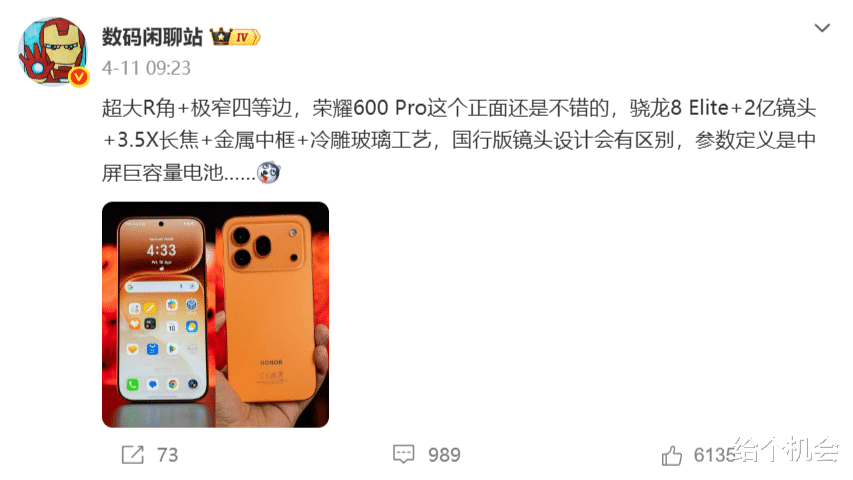 荣耀600 pro是高配机型,具有更强的综合性,性能方面搭载骁龙8Elite处理器,后置2亿像素大底防抖主摄+超广角镜头+3.5倍长焦镜头,能玩游戏也能拍高清照片,此前就爆料过会配备9000mAh以上的大电池,在续航方面也领先同档,采用一块6.57英寸OLED直屏,有大R角+极窄四等边,正面的颜值还挺高。