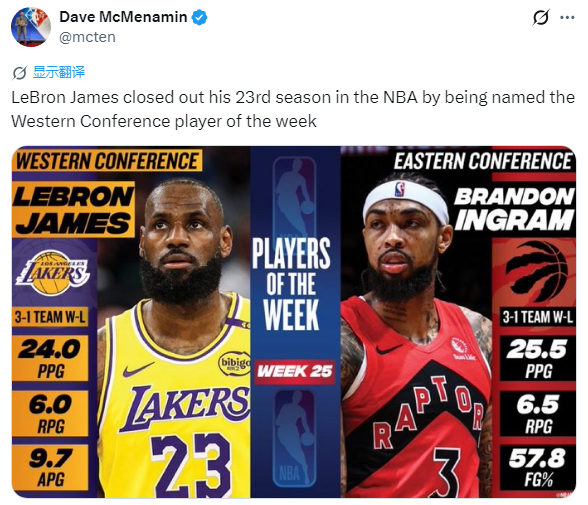 詹姆斯荣获西部周最佳引热议,湖人记者Dave McMenamin表示:勒布朗-詹姆斯以入选西部周最佳球员的身份结束了他在NBA的第23个赛季。