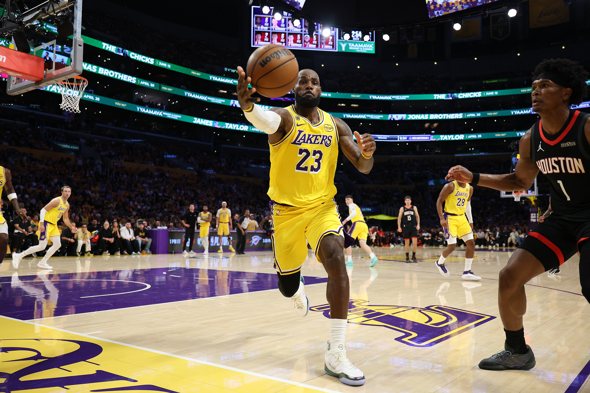 第二节两队进攻都不好,不过湖人一度领先到两位数,可上半场最后65秒湖人进攻哑火,被火箭一波6-0缩小分差,半场打完湖人50-48暂时领先2分,这一节詹姆斯4投1中拿到2分2助攻,防守端追防大帽阿门;期间詹姆斯全神贯注,露出死亡之瞳。