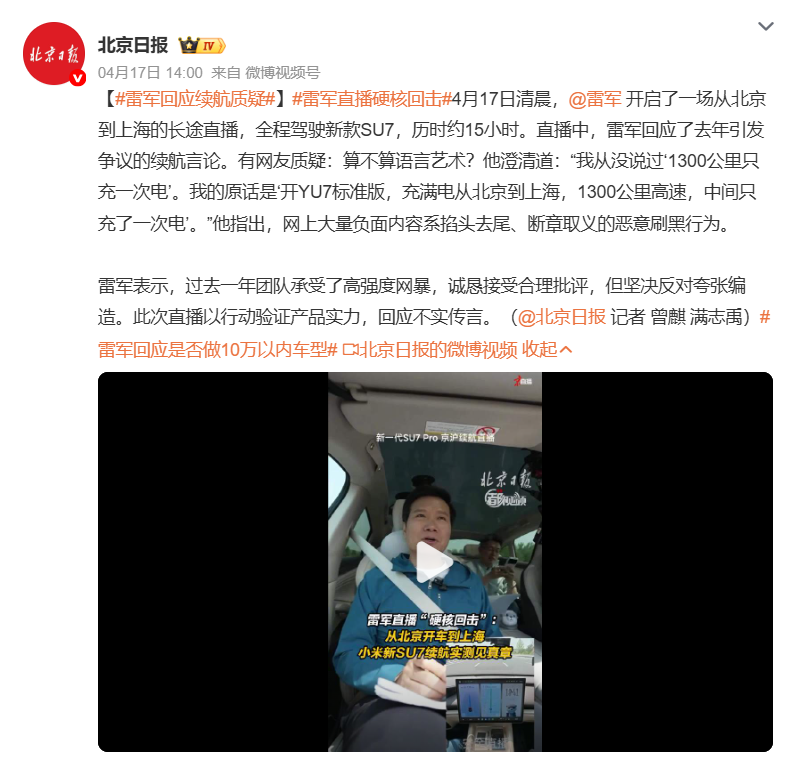 2026年4月17日清晨六点半,雷军搭乘新一代小米SU7 Pro,从北京出发开往上海,开启了一场全程直播的长途续航测试。当车辆行驶在滨州服务区附近时,这位小米创始人面对镜头,做出了一个措辞考究的澄清:“我从没说过‘1300公里只充一次电’。我的原话是‘开YU7标准版,充满电从北京到上海,1300公里高速,中间只充了一次电’。”