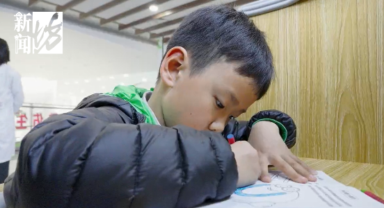 吴先生今天带了一双儿女来体检,中午有两个多小时空闲。看到有桌椅的姐弟俩,毫不犹豫坐了上去,拿出画本和蜡笔,自己玩起来。