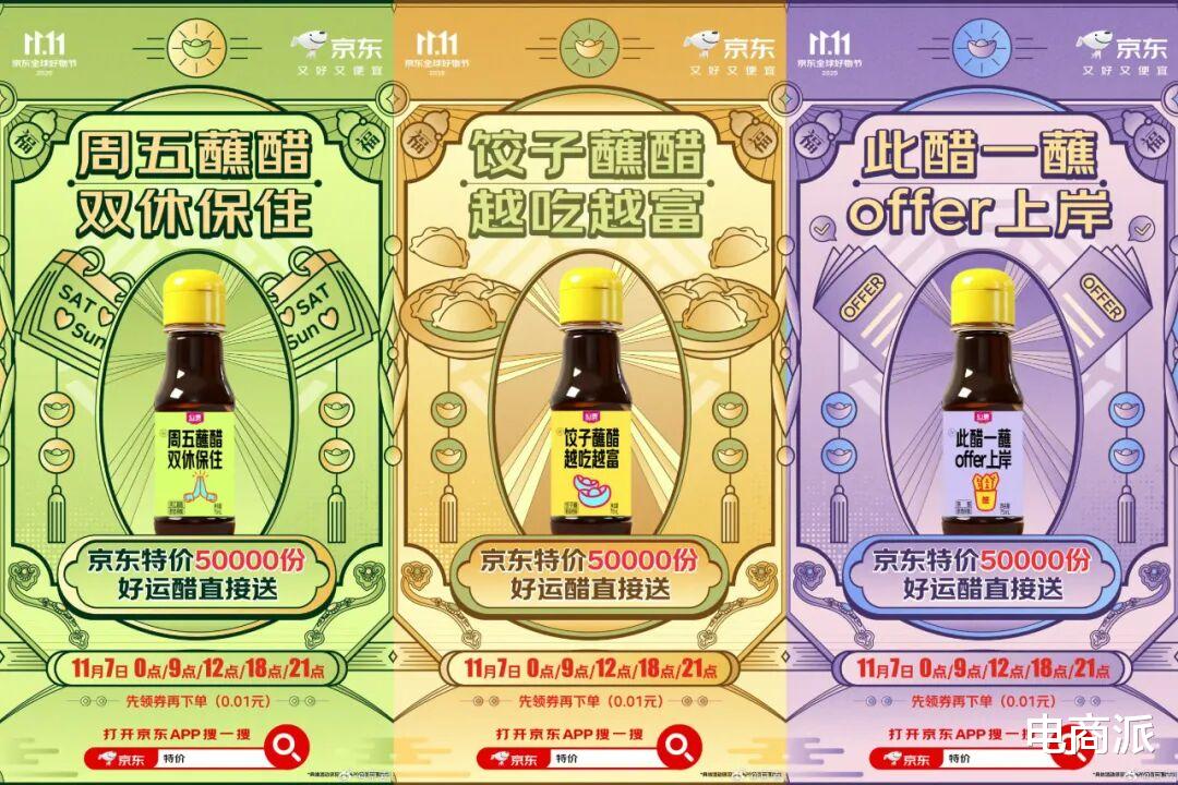 直到和京东特价频道合作,情况开始不一样了。京东特价频道深入洞察了年轻消费者的心理后,发现当下的年轻消费者对“好运”“玄学”很感兴趣,也非常善于用“玄学”来为生活制造仪式感。于是便与仙妻共创了一款“好运醋”,瓶身上印着“周五蘸醋,双休保住”“饺子蘸醋,越吃越富”“此醋一蘸,offer上岸”等俏皮吉祥话,让产品的购买和分享都自带话题与情绪价值。