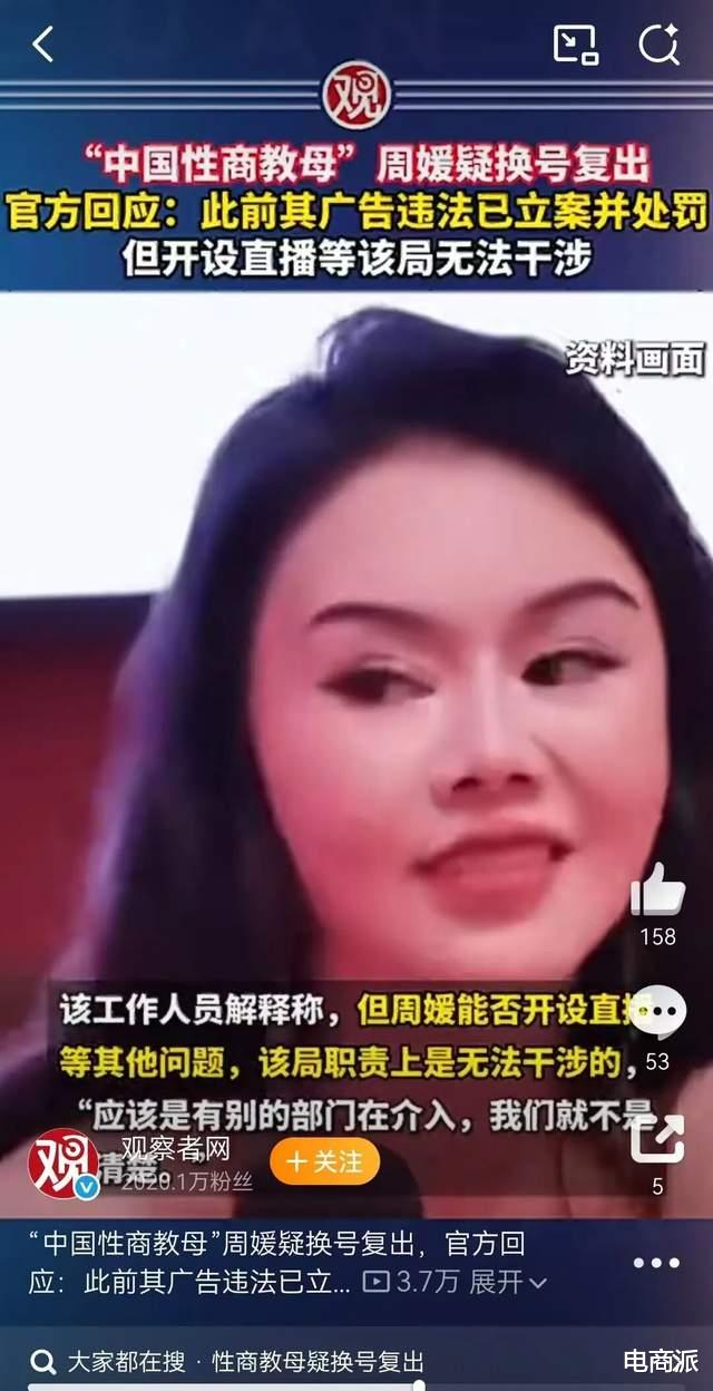 不同于反诈老陈的解封,此前被抖音封禁的 “性商教母” 周媛,并未等到解封的机会。不过,她转战到其他平台复出了。