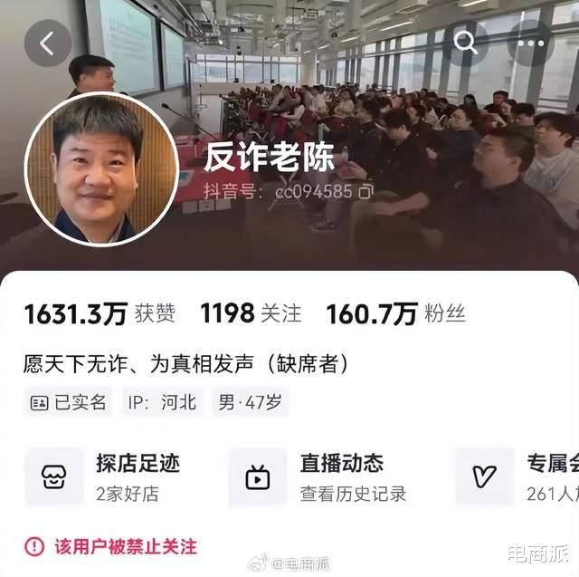 今年 2 月底,抖音电商安全与信任中心发布了有关“违规蹭热不当获利”内容治理规范的公告,并处理了大批账号。其中就有反诈老陈,其抖音账号页面显示 “该用户被禁止关注”。