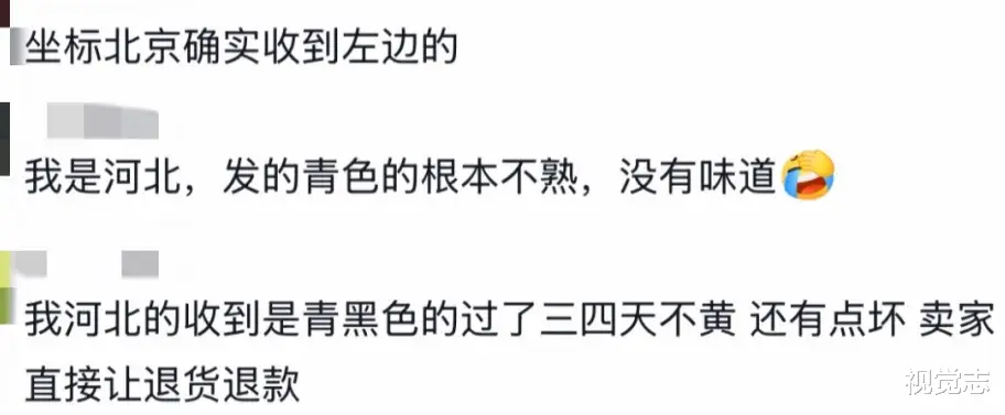 自己在北京收到的金黄又新鲜多汁,妈妈收到的又青又黑,尝起来“水咕咕”的,没有味道不说,甚至完全就不能吃。她气得把自己的经历发到了网上质问:“完全不能吃,你发过来干什么?这差别也太大了吧……”