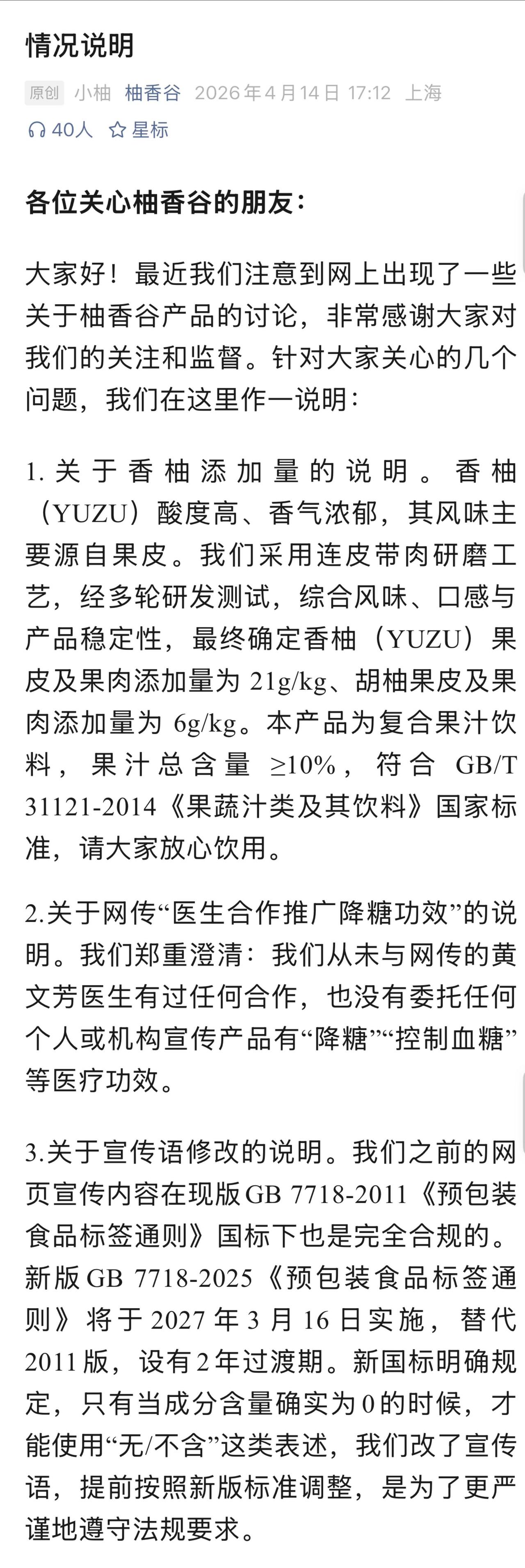 关于产品标注“果汁总含量≥10%”这个点,其实在4月14日,柚香谷官方公众号就发布过情况说明:“本产品为复合果汁饮料,果汁总含量≥10%,符合GB/T31121-2014《果蔬汁类及其饮料》国家标准,请大家放心饮用。”该说明同时对网传“与医生合作推广降糖功效”以及企业宣传用语调整等情况一并作出了澄清与说明。