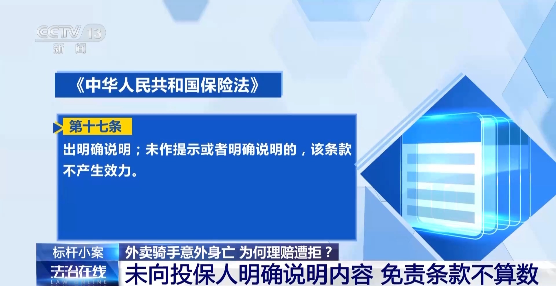福州市中级人民法院清算与破产审判庭庭长汪霞:如果你只想将保障期间限定为骑手的配送期间,那么应该要更公开透明地将保障期间展示给投保人。根据现有证据来看,保险公司却对该条款没有用加黑、加粗等方式来提示给投保人。所以我们认为,这部分内容不能构成合同内容,保险公司应该在全天24小时内,对骑手的意外事故承担赔偿责任。
