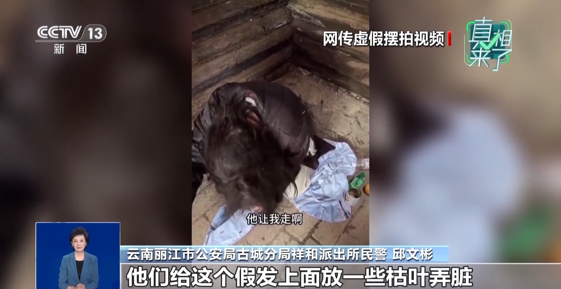云南省丽江市公安局古城分局祥和派出所民警邱文彬:演员杨某某去准备的时候,特意叮嘱她,不要自己化妆,不要往脸上擦粉。到了现场以后,他们给假发上面放一些枯叶弄脏,把假发弄得凌乱,再给她披上去,然后在她的手臂上弄一些受伤的痕迹,当然那个也是化妆化上去的。衣着方面也会强调,不要穿白鞋子、干净的鞋子,然后用床单裹住,穿着破棉袄,让她瑟瑟发抖,整个过程都是按照刘某他们设计好的剧本来演的。