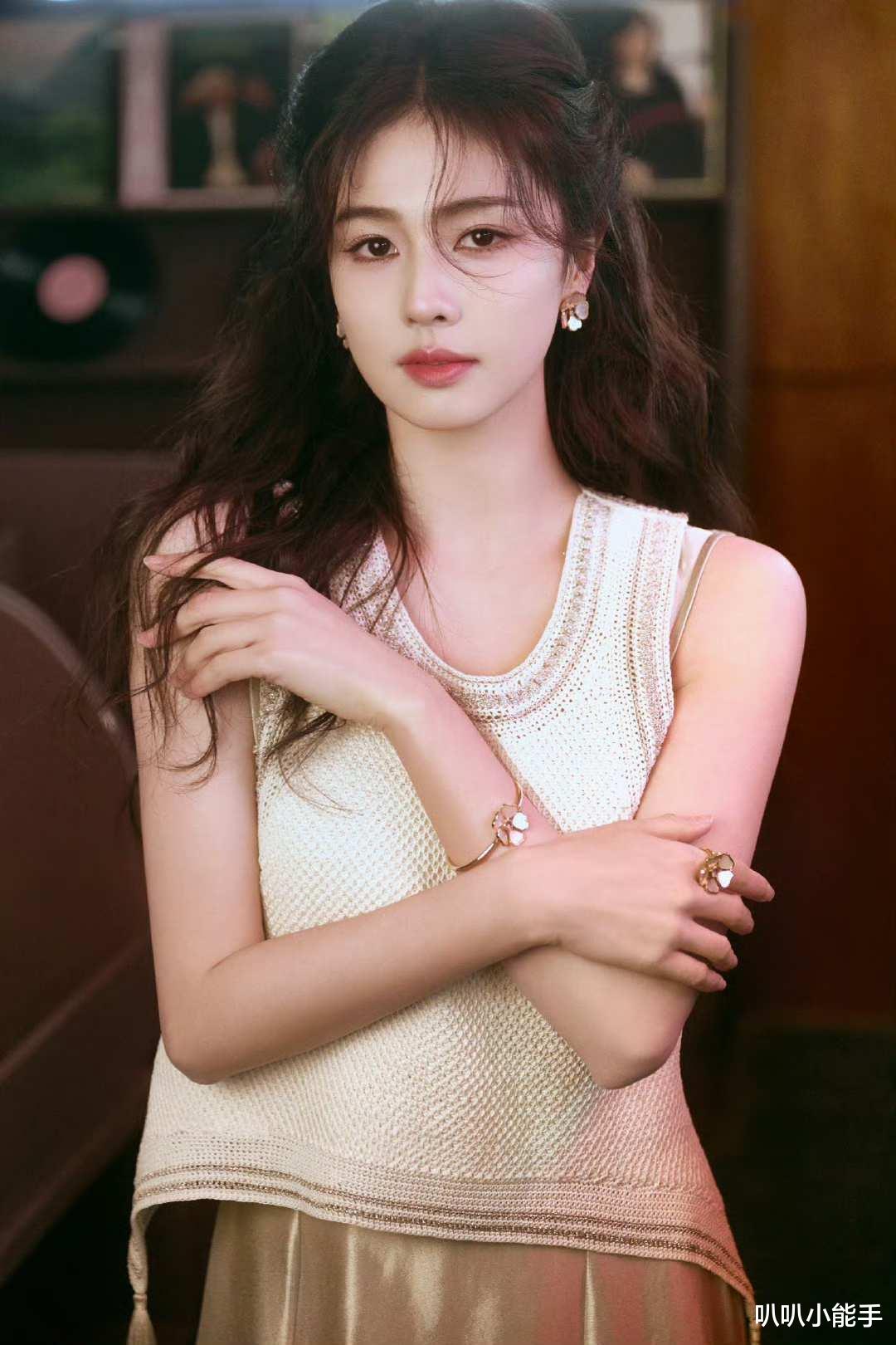 先瞅瞅这裙子,上半身是带着点亮片的无袖设计,下半身是垂坠感超强的缎面长裙,颜色是暖乎乎的香槟金,把白鹿的皮肤衬得白到发光。她坐的时候还故意把腿翘起来,露出脚上的金色厚底凉鞋,这小动作像是在说“姐今天就是要美出新高度”,连裙摆掉在地上都像在演“公主的拖尾”——不过这拖尾是缎面的,比咱们平时穿的“睡裙”还要贵气。